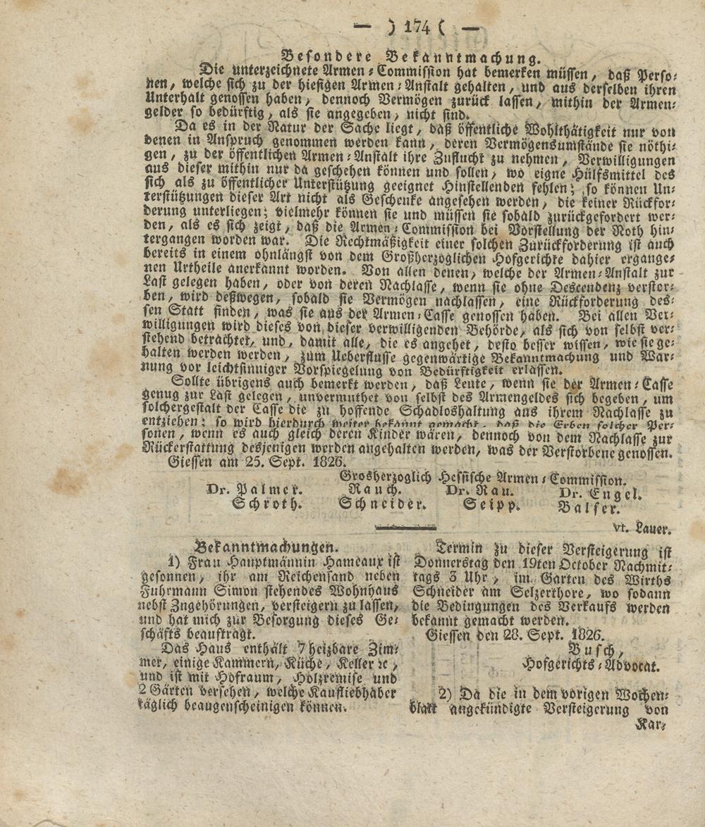 Termin zu dieser Versteigerung ist Donnerstag den 19ten October Nachmit- tags 3 Uhr - im Garten des Wirths Schneider am Selzerthore, wo sodann die Bedingungen des Verkaufs werden bekannt gemacht werden.