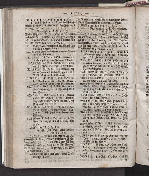 • - 3) Auf freiwilliges Ansuchen der Wittwe des Burgers rmd Fuhrmanns Daniel Hinkel dahier, werden Montag den 7tenScptbr. Nachmittags 2 Uhr auf dabicsigcm Nathhaus nachstehende Gütcrstückc öffentlich an den Meistbietenden versteigert, als