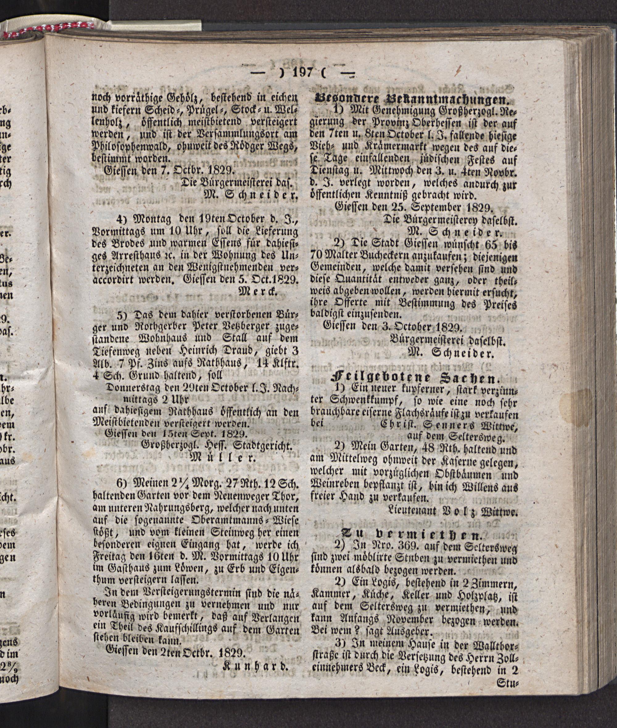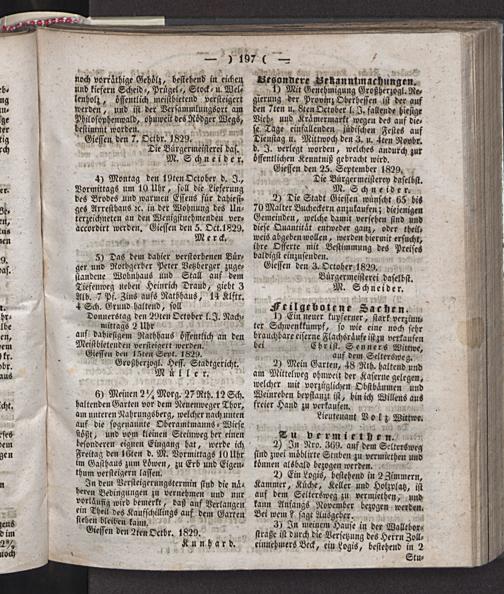 Giessen den 3. Oktober 1829. Bürgermeisterei daselbst.