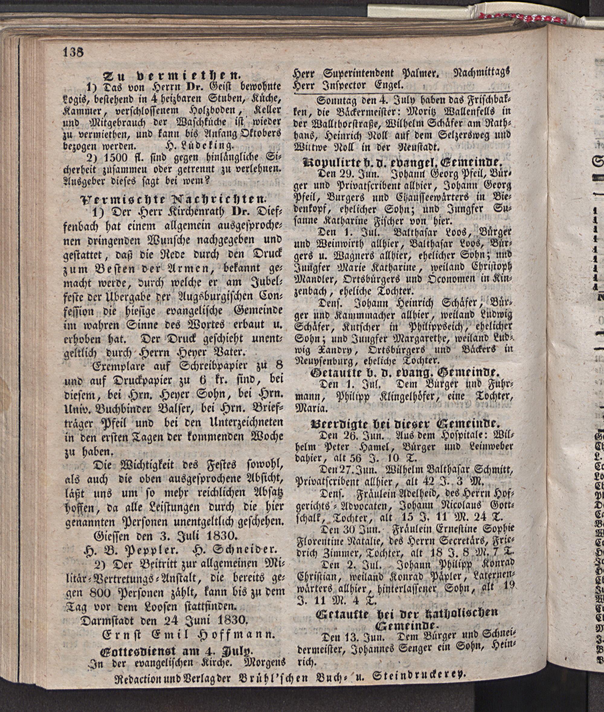Exemplare auf Schreibpapier zu 8 und auf Druckpapier zu Ö fr. sind, bei diesem, bei Hrn. Heyer Sohn, bei Hrn. Univ. Buchbinder Balser, bei Hrn. Briefträger Pfeil und bei den Unterzeichneten in den ersten Tagen der kommenden Woche zu haben,