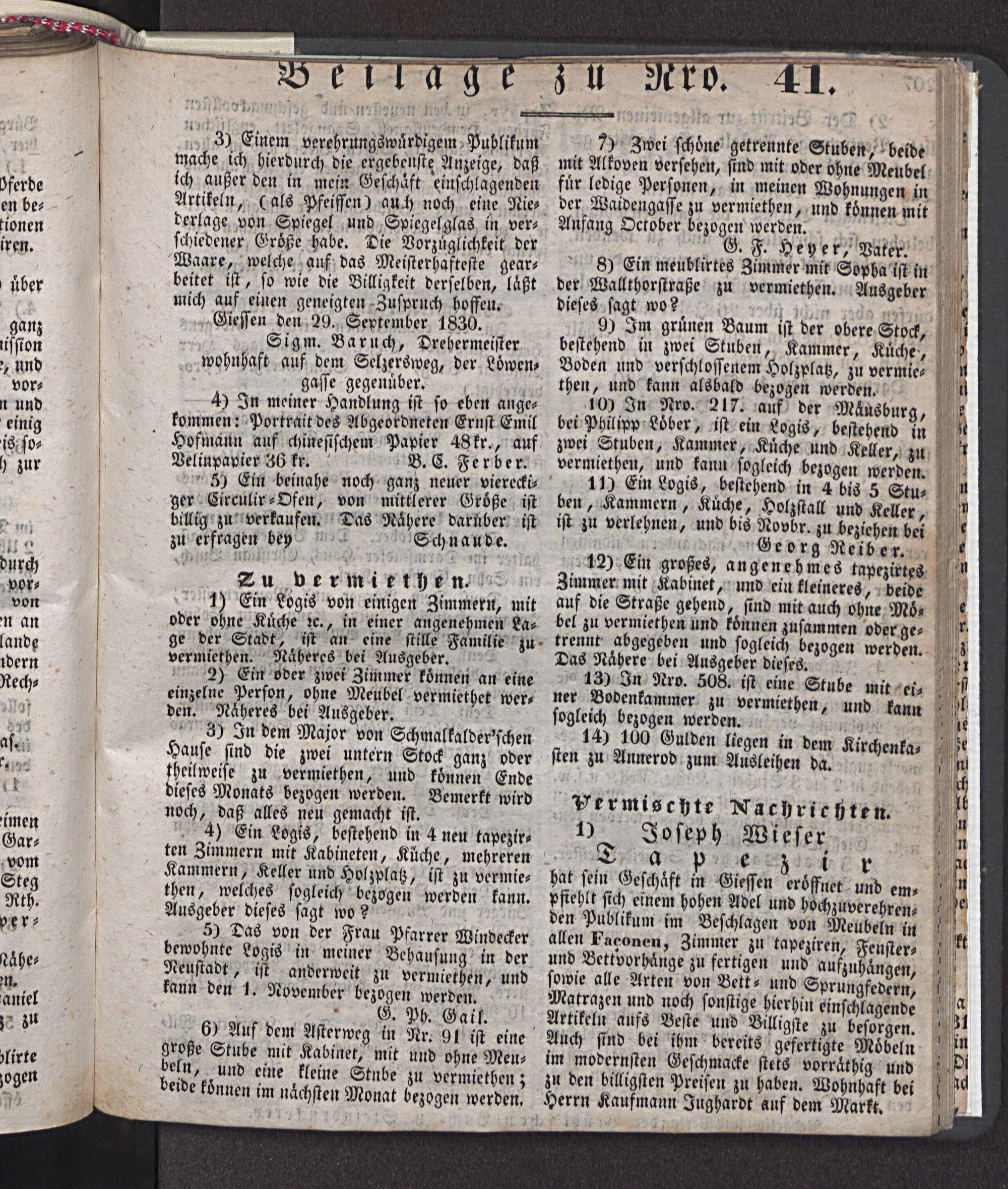 9) Im grünen Baum ist der obere Stock, , , Slgm. Baruch, Drehermeister bestehend in zwei Stuben, Kammer, Küche, wohnhaft auf dem Sclzeröweg, der Löwen, Boden und verschlossenem Holzplatz, zu vcrmie- gliffe gegenüber. then, und kann alsbald bezogen werden