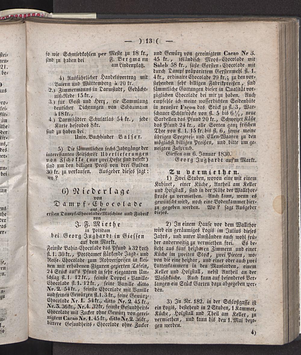 Feinste Bahia-Chocolade daö Pfund -> 32 Loth 111. 30 fr., Potsdamer stärkende Jagd - und Reise- Chocolade zum Nohverspcisen in kleinen mit erhabenen Figuren gezierten Tafeln, 24 Stuck aufs Pfund tu sehr elegantem Umschlag fl.l. 12 fr., feinste Doppel - Vanillc- Cbocolade fl.l. 12 fr., seine Vanille ditto Nr. 2. 54 fr., feinste Chocolade mit Vanille und feinen Gewürzen fl. l. 3 fr., feine Gewürz- Ehocoladc Nr. 1. 54 fr., ditto Nr. 2. 45 fr., Nr.3.36fr., Nr.4.32fr, feinste Gcsundhcits, Ehocolade mit Zucker ohne Gewürz von gereinigtem Faeao Nr. 1.45 fr., ditto Nr.2. 36fr., ältere Gesuudhcits - Chocolade ohne Zucker