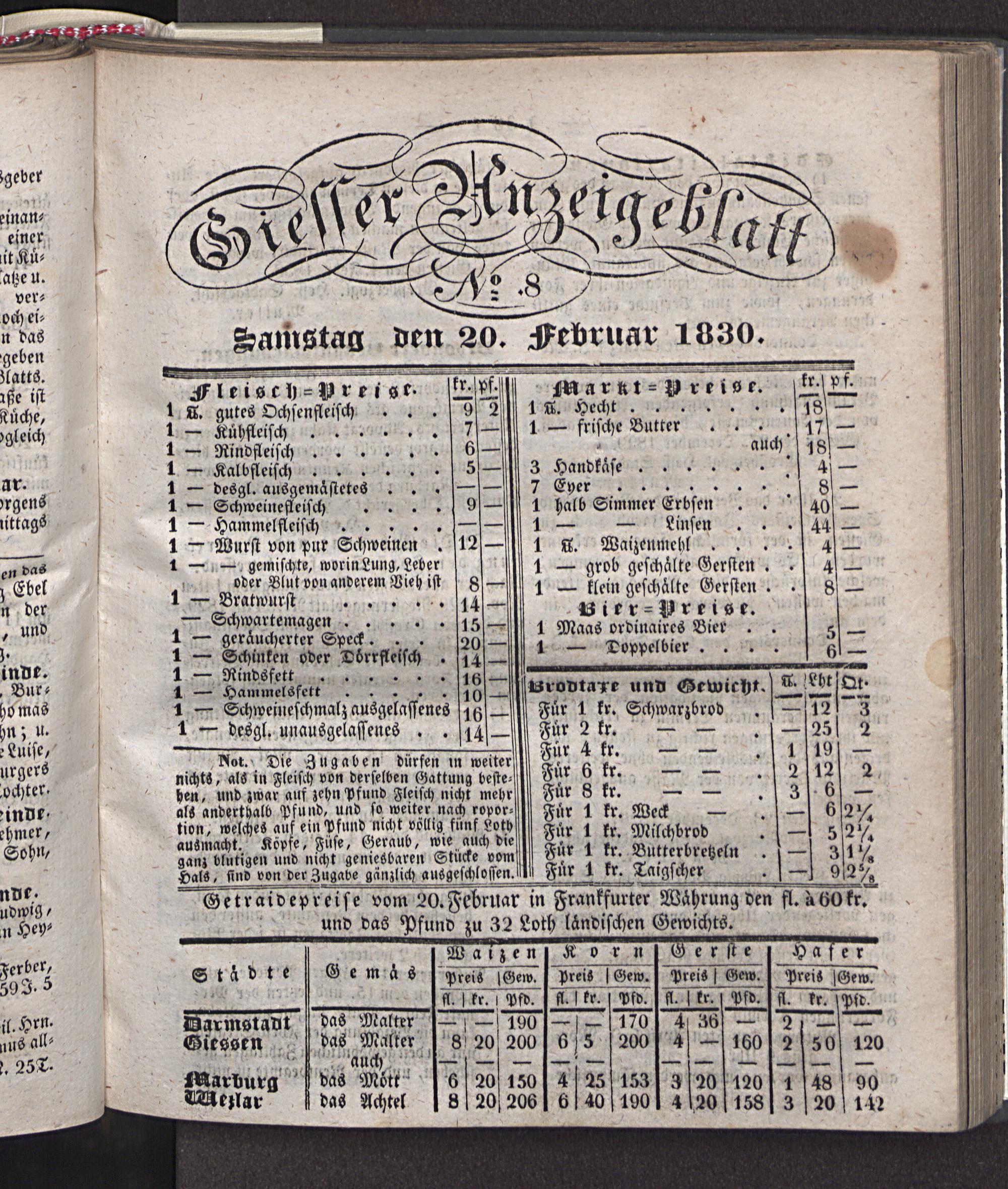 Getraidepreise vom 20.Februar in Frankfurter Währung den ft aüOfr.* und das Pfund zu 32 Loth ländischen Gewichts.____________
