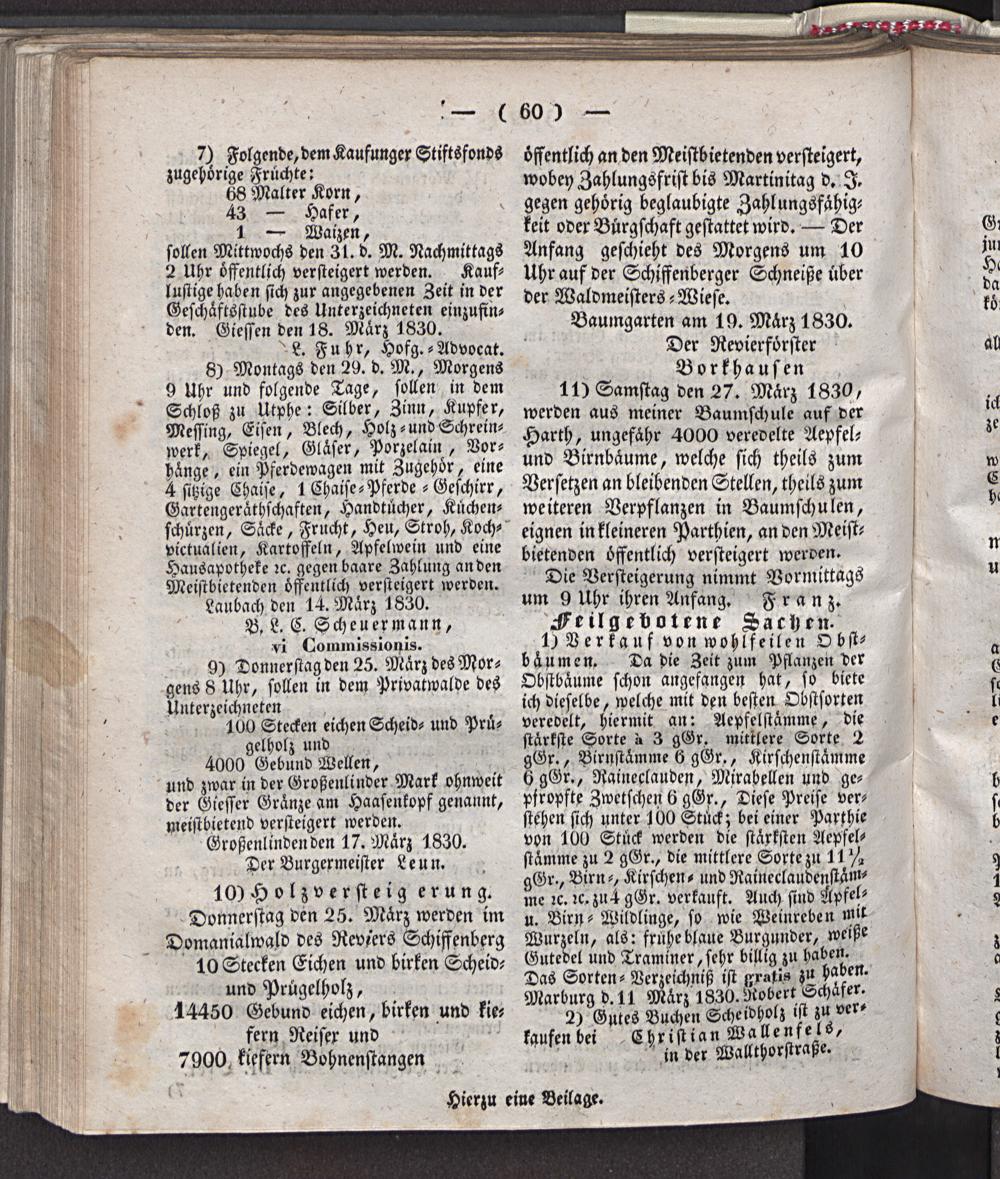 11) Samstag den 27. März 1830, werden aus meiner Baumschule auf der Harth, ungefähr 4000 veredelte Aepfel- und Birnbäume, welche sich theils zum Versetzen an bleibenden Stellen, theils zum weiteren Verpflanzen in Baumschulen, eignen in kleineren Parthien, an den Meistbietenden öffentlich versteigert werden.