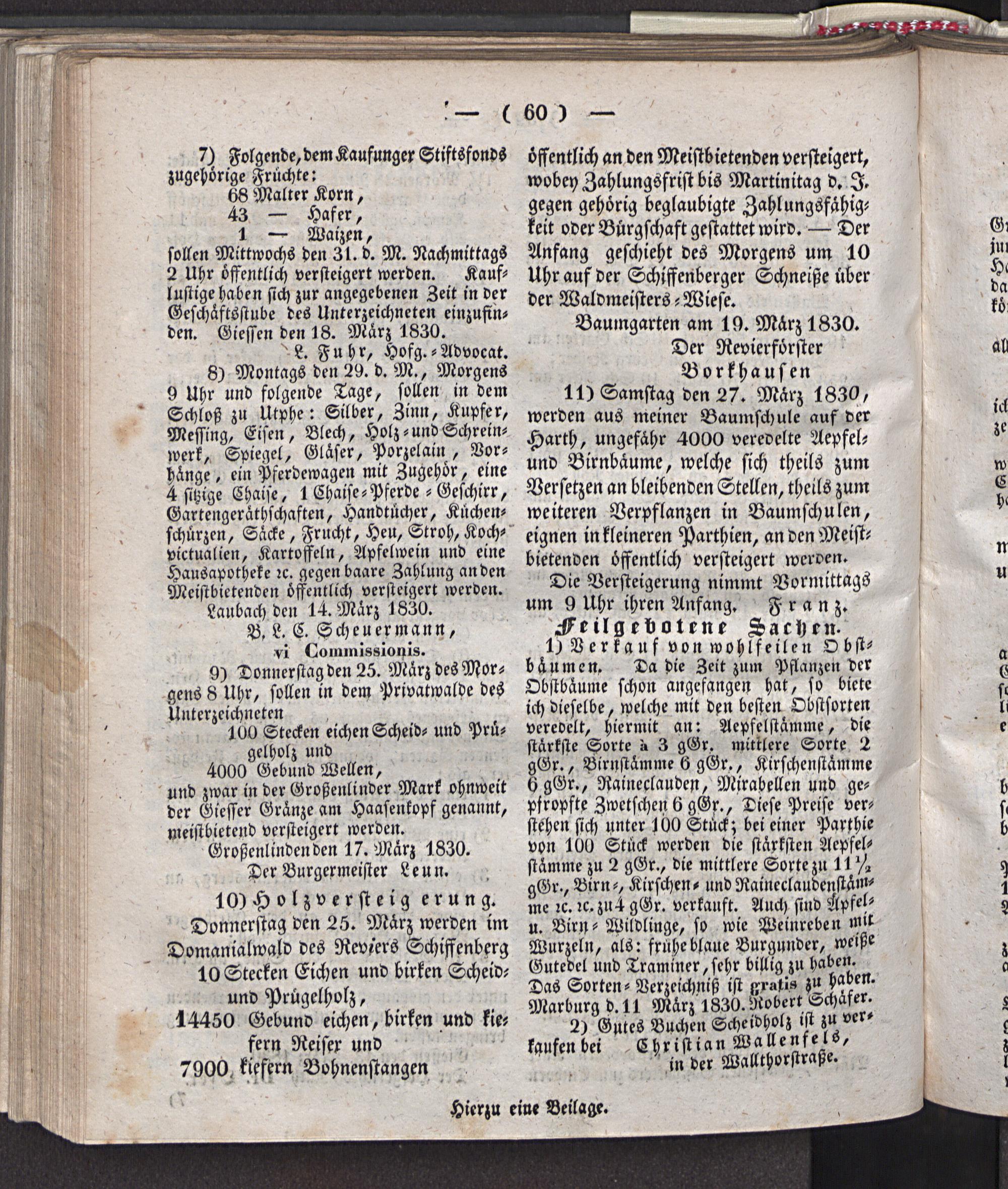öffentlich an den Meistbietenden versteigert, wobey Zahlungsfrist bis Martinitag d, I. gegen gehörig beglaubigte Zahlungsfähigkeit oder Bürgschaft gestattet wird. — Der Anfang geschieht des Morgens um 10 Uhr auf der Schiffenberger Schneiße über der Waldmeisters-Wiest.