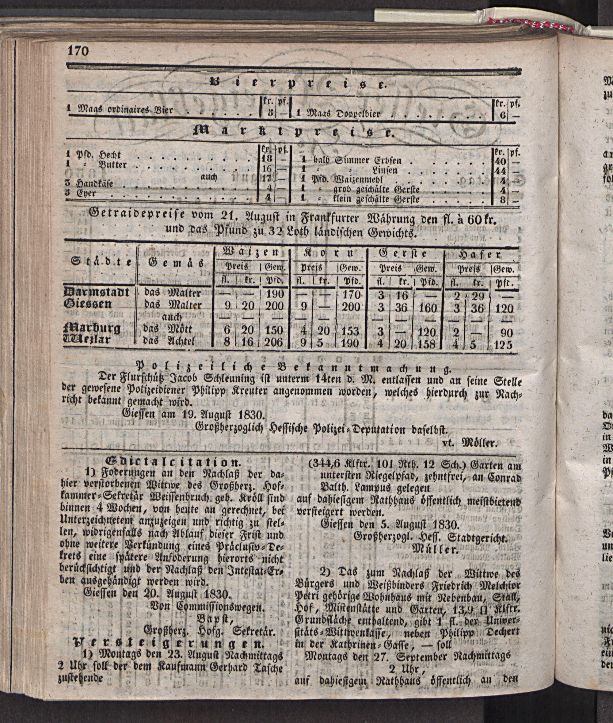 liessen den 5. August 1830. Großherzogl. Hess. Stadtgericht. Müller.