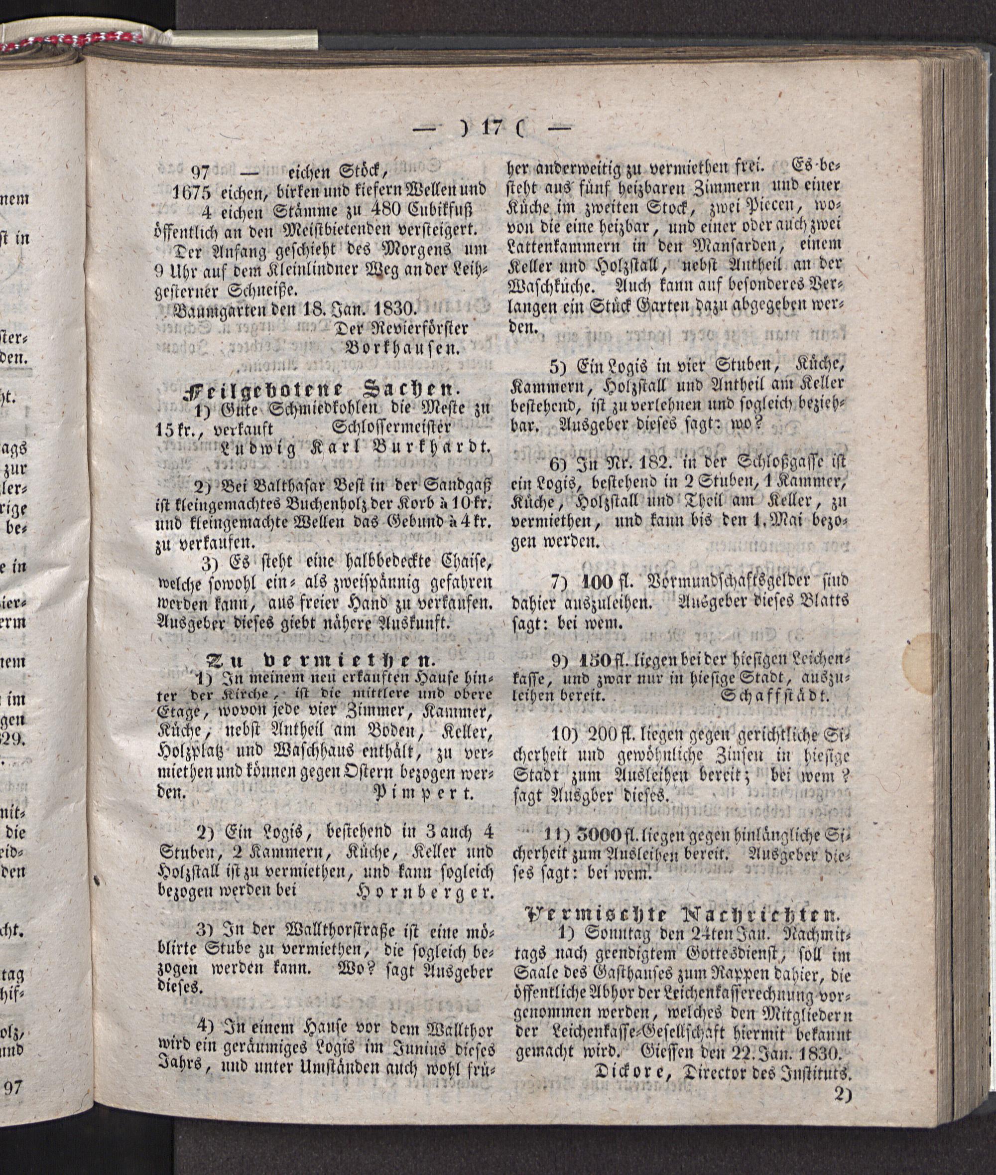 1) Sonntag den 24tenJan. Nachmittags nach geendigtem Gottesdienst, soll im Saale des Gasthauses zum Rappen dahier, die öffentliche Abhor der Leichenkasserechnung vvr- gcnommcn werden, welches den Mitgliedern der Leichcnkaffe-Gesellschaft hiermit bekannt gemacht wird. Giessen den 22. Jan. 1830.