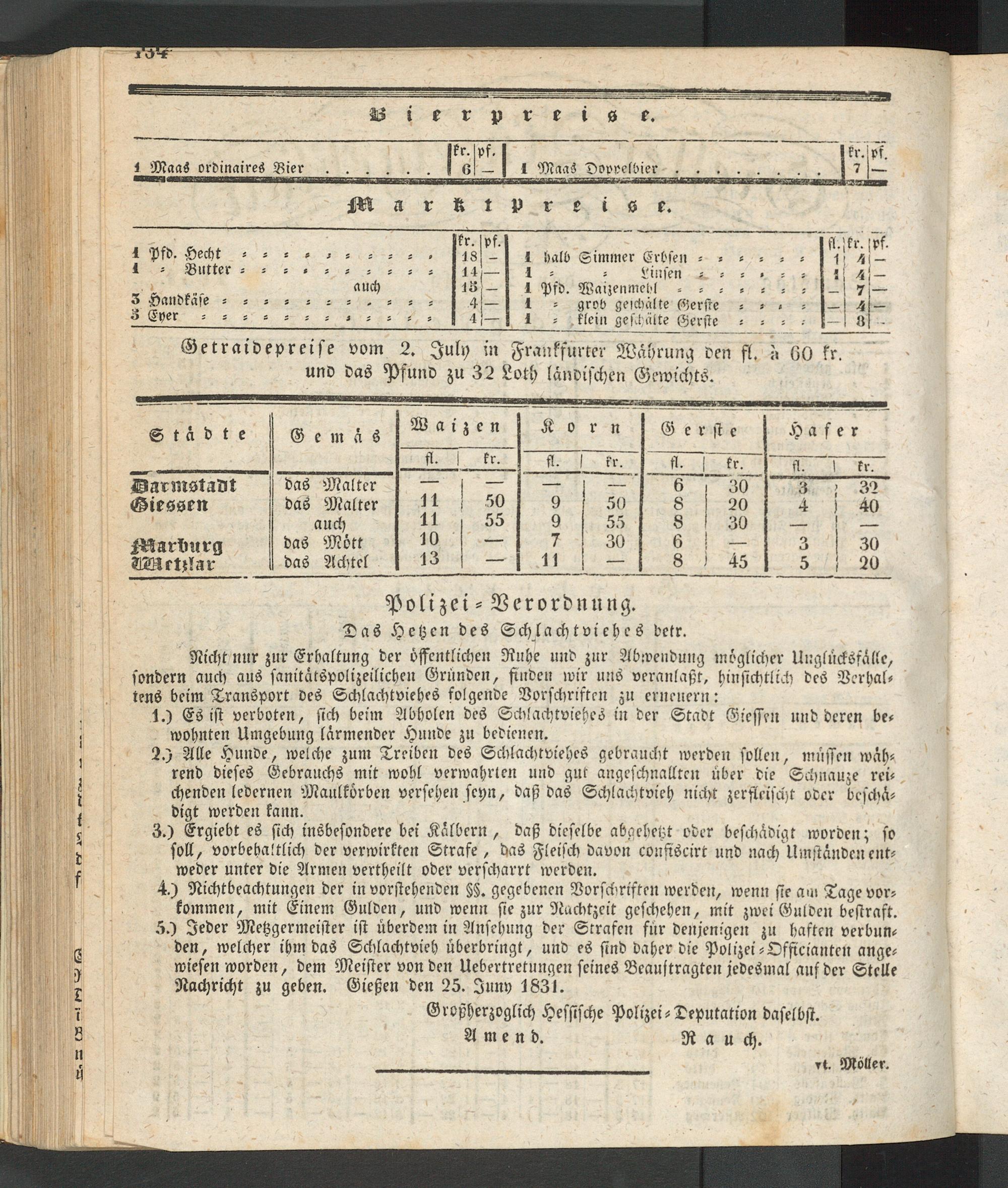 5 .) Jeder Metzgermeister ist überdem in Ansehung der Strafen für denjenigen zu haften verbunden, welcher ihm das Schlachtvieh überbringt, und es sind daher die Polizei-Officianten angewiesen worden, dem Meister von den Uebertretungen seines Beauftragten jedesmal auf der Stelle Nachricht zu geben. Gießen den 25. Juny 1831.