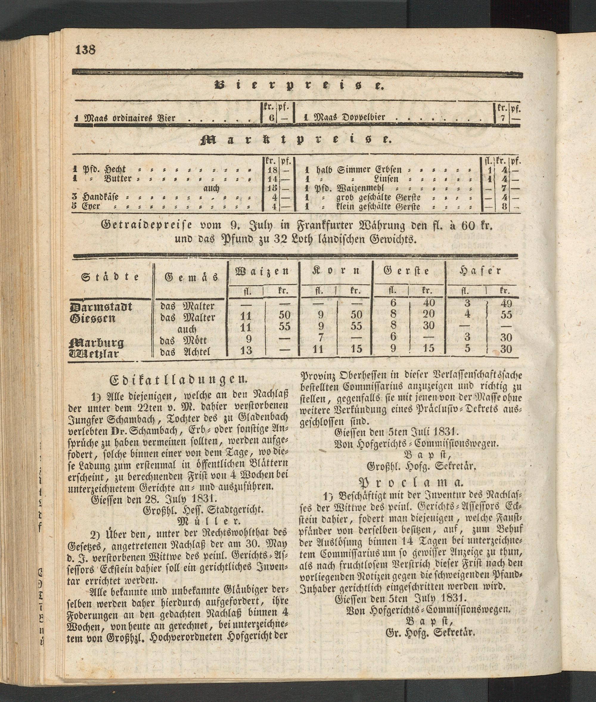 1) Alle diejenigen, welche an den Nachlaß der unter dem 22ten v. M. dahier verstorbenen Jungfer Schambach, Tochter des zu Gladenbach verlebten »r. Schambach, Erb - oder sonstige Ansprüche zu haben vermeinen sollten, werden anfge- fodert, solche binnen einer von dem Tage, wo diese Ladung zum erstenmal in öffentlichen Blattern erscheint, zu berechnenden Frist von 4 Wochen bei unterzeichnetem Gerichte an- und auszusühren.