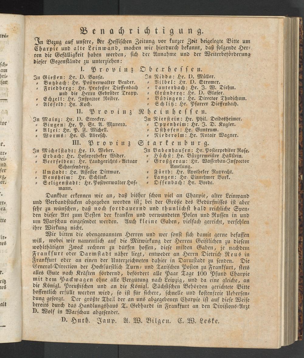 Wir bitten die obengenannten Herren und wer sonst sich damit gerne befassen will, wobei wir namentlich auf die Mitwirkung der Herren Geistlichen zu diesem wohlthätigen Zweck rechnen zu dürfen hoffen, diese milden Gaben, je nachdem Frankfurt oder Darmstadt näher liegt, entweder an Herrn Dietrich Reus in Frankfurt oder an einen der Unterzeichneten dahier in Darmstadt zu senden. Die Gencral-Direction der Hochsürsilich Turn- und Tarischen Posten zu Frankfurt, stets alles Gute nach Kräften fördernd, befördert alle Paar Tage 100 Pfund Charpie mit dem Packwagen ohne alle Vergütung nach Leipzig, und da eine gleiche, an die Königl. Preußischen und an die Königl. Sächsischen Behörden gerichtete Bitte hoffentlich erfüllt werden wird, so ist für sichere, schnelle und kostenfreie Uebcrsen- dung gesorgt. Der größte Theil der an uns abgegebenen Charpie ist auf diese Weise bereits durch das Handlungshaus T. Gebhardt in Frankfurt an den Divisions-Arzt D. Wolf in Warschau abgesendet.