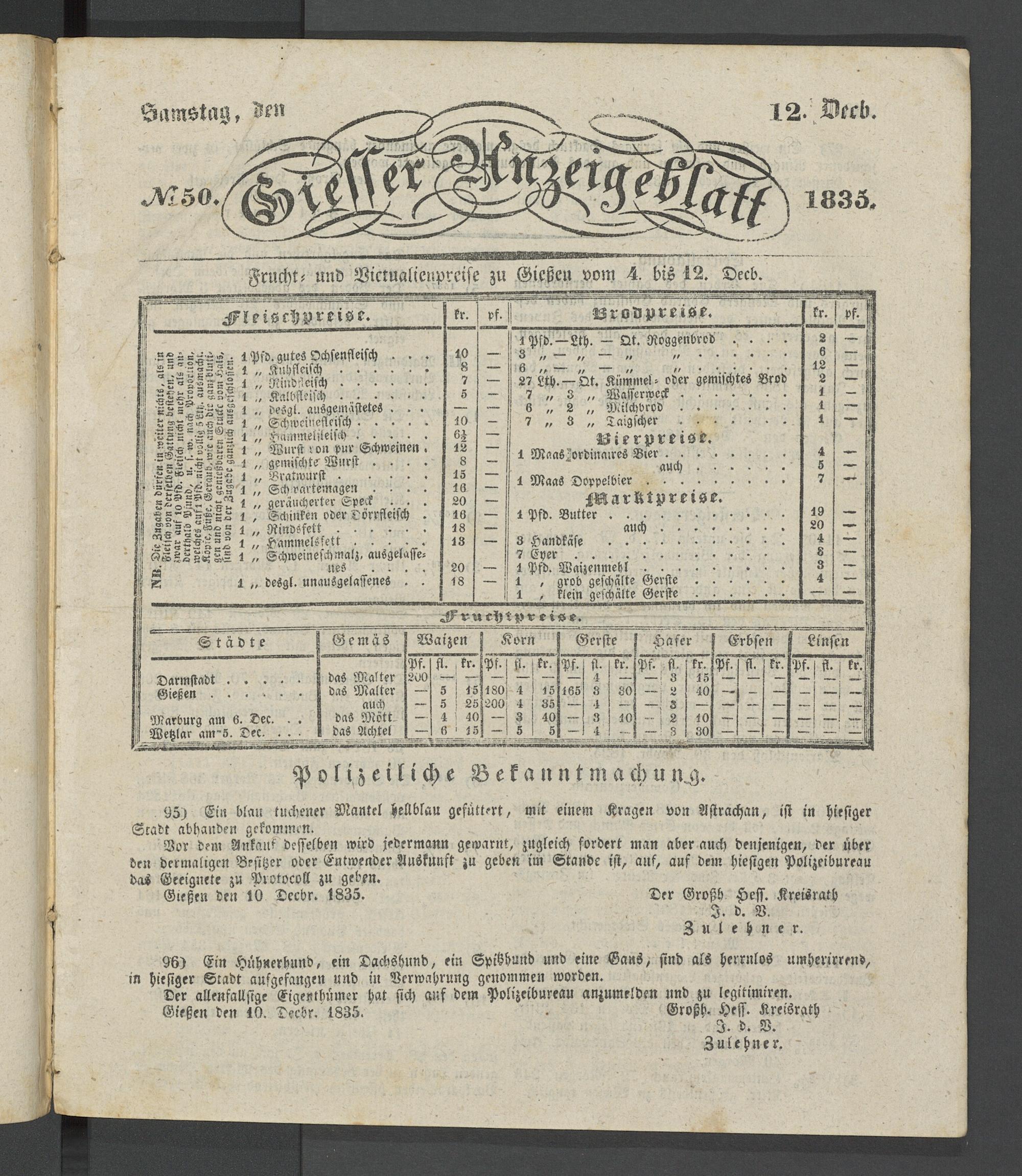 Gießen den 10. Decbr. 1835. • Großh. Hess. Kreisrath