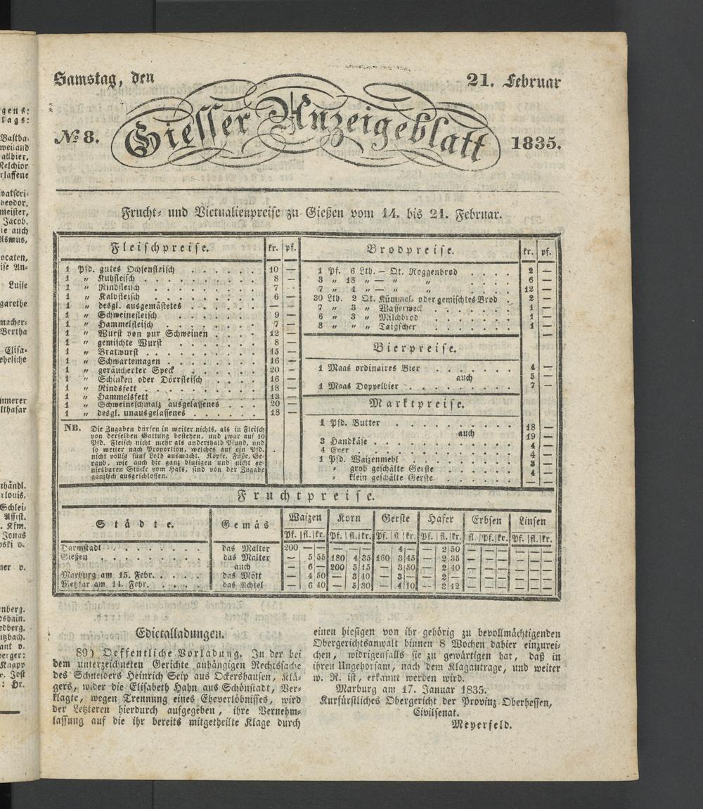 Frucht- und Vittualienpreise zu Gießen vom 14. bis 21. Februar.