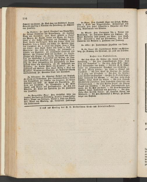 Im Hirsch-. firn. Oeconomen Pitz u. Benner von Breidenbach, Hr. Fuhrmann Widder von Schönau, Hr. Major Kaufmann nebst Familie von Wien, Arn Kaust. Wick, Kennawick u. Rast aus Würtemberg, Hrn Kaust. Emmerich von Rodheim u. Hoffmann von Hamburg.