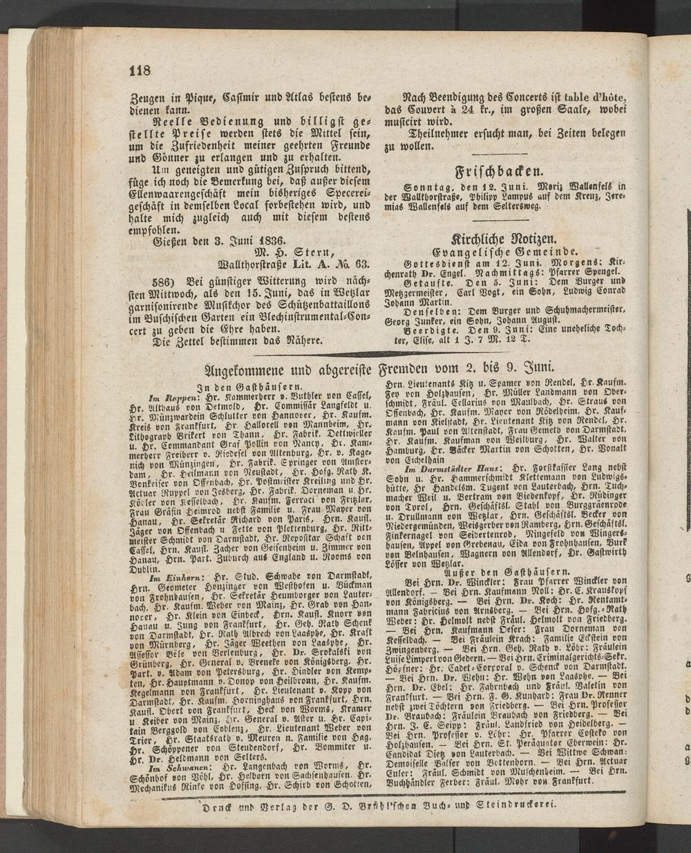 Im Darmstädter Haus; Hr. Forslkassier Lang nebst Sohn u. Hr. Hammerschmidt Klettemann von Ludwigs. Hütte, Hr Handclsm. Tugent von Lauterbach, Hrn. Tuch, wacher Weil u. Bertram von Biedenkopf, Hr. Rüdinger von Tyrol, Hrn. Geschäftsl. Stahl von Burggraenrode u. Drullmann von Wetzlar, Hrn. Geschäfts!. Becker von Niedergemünden, Weisgerber von Ramberg, Hrn. Geschaftsl. Finkernagel von Seibertenrod, Ningefeld von Wingershausen, Appel von Grebenau, Eida von Frohnhausen, Burk von Beinhausen, Wagnern von Mendorf, Hr. Gastwirth Löffer von Wetzlar. ,