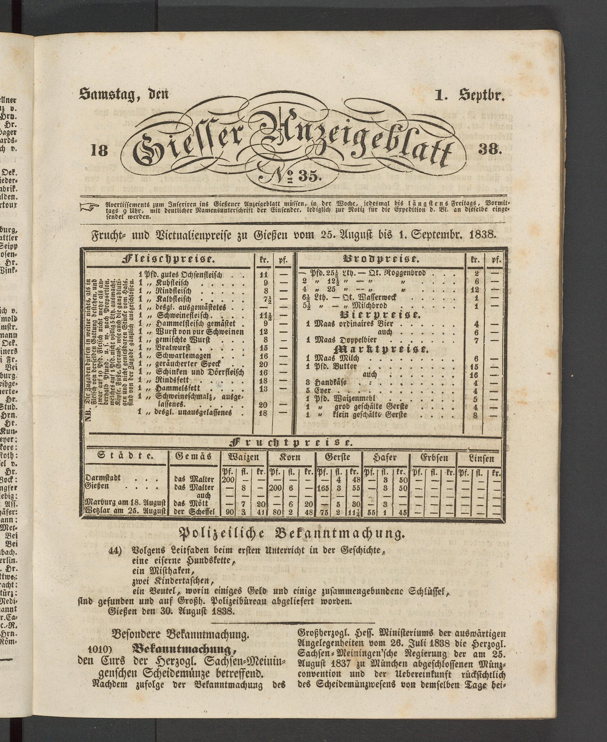 Frucht- und Victualieupreise zu Gießen vom 25. Angnst bis 1. Septembr. 1838.