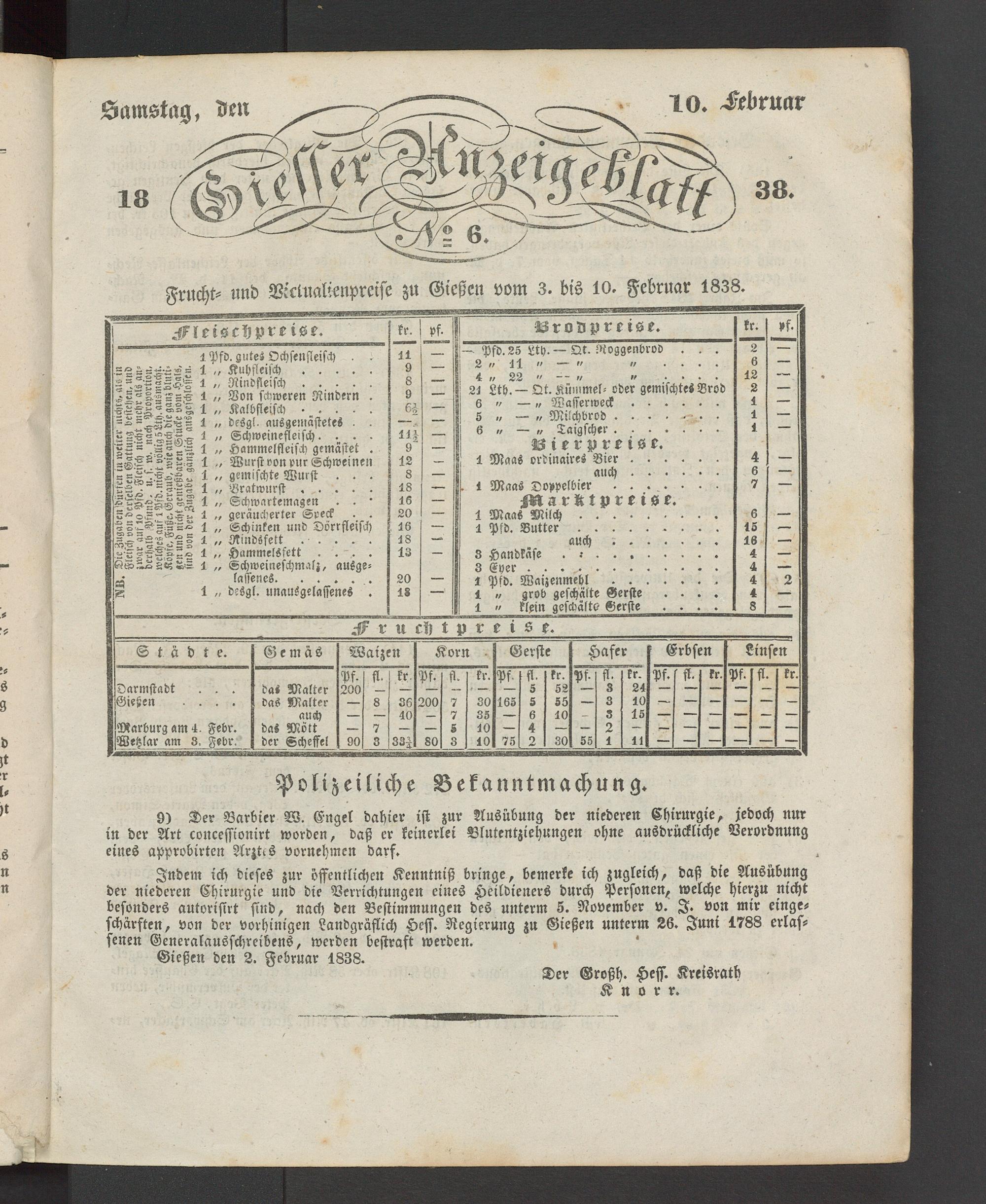 -- und Vcclualienpreise zu Gießen vom 3. bis 10. Februar 1838.