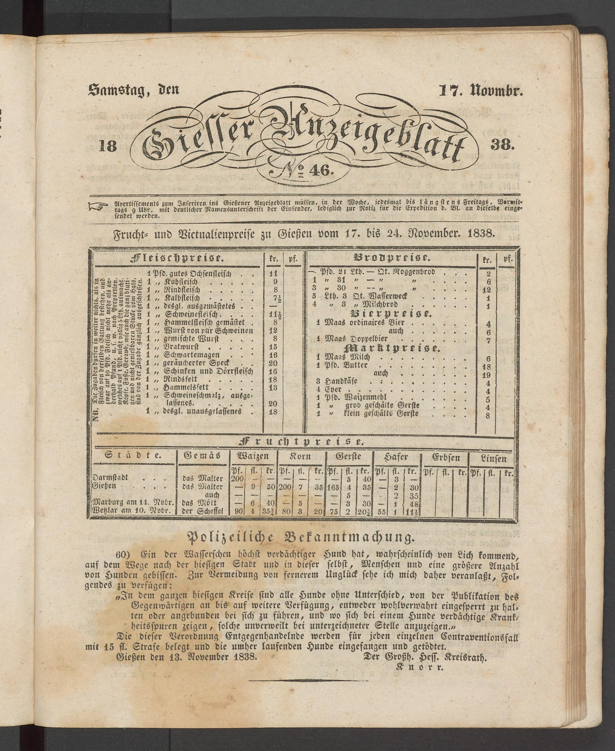 Gießen den 13. November 1838. Der Großh. Hess. Kreisralh.