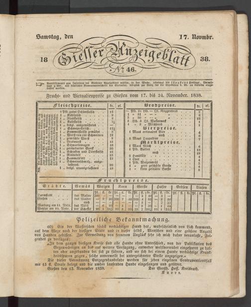 Frucht- und Victualienprcise zu Gießen vom 17. bis 24. November. 1838.