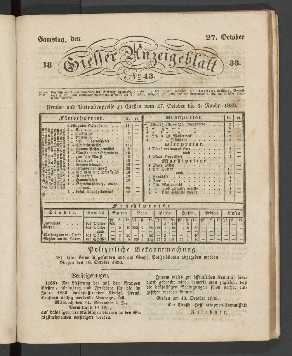 Frucht- und Victualienpreise zu Gießen vom 27. Oktober bis 3. Novbr. 1838.