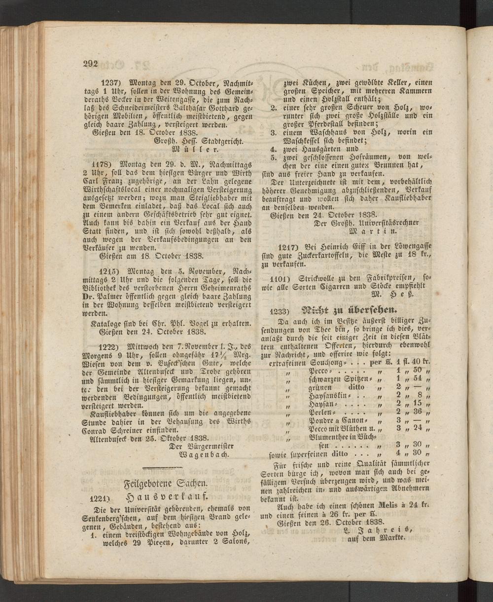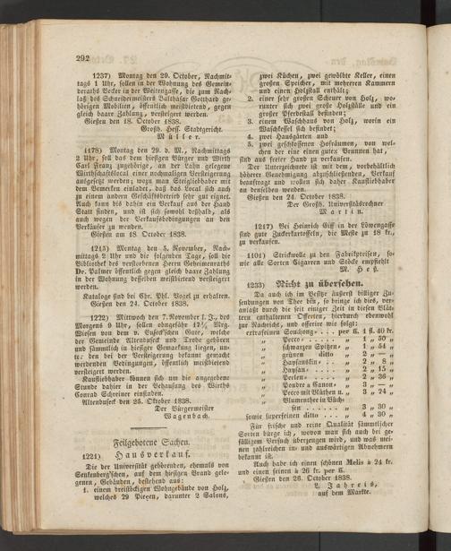 Kataloge sind bei Chr. Phl. Vogel zu erhalten. Gießen den 24. October 1838.