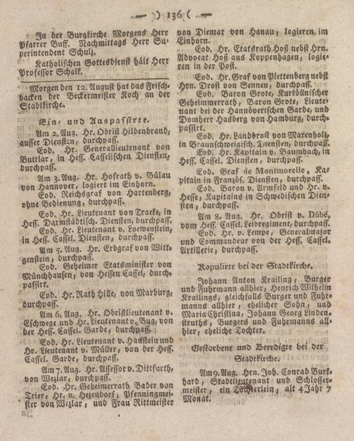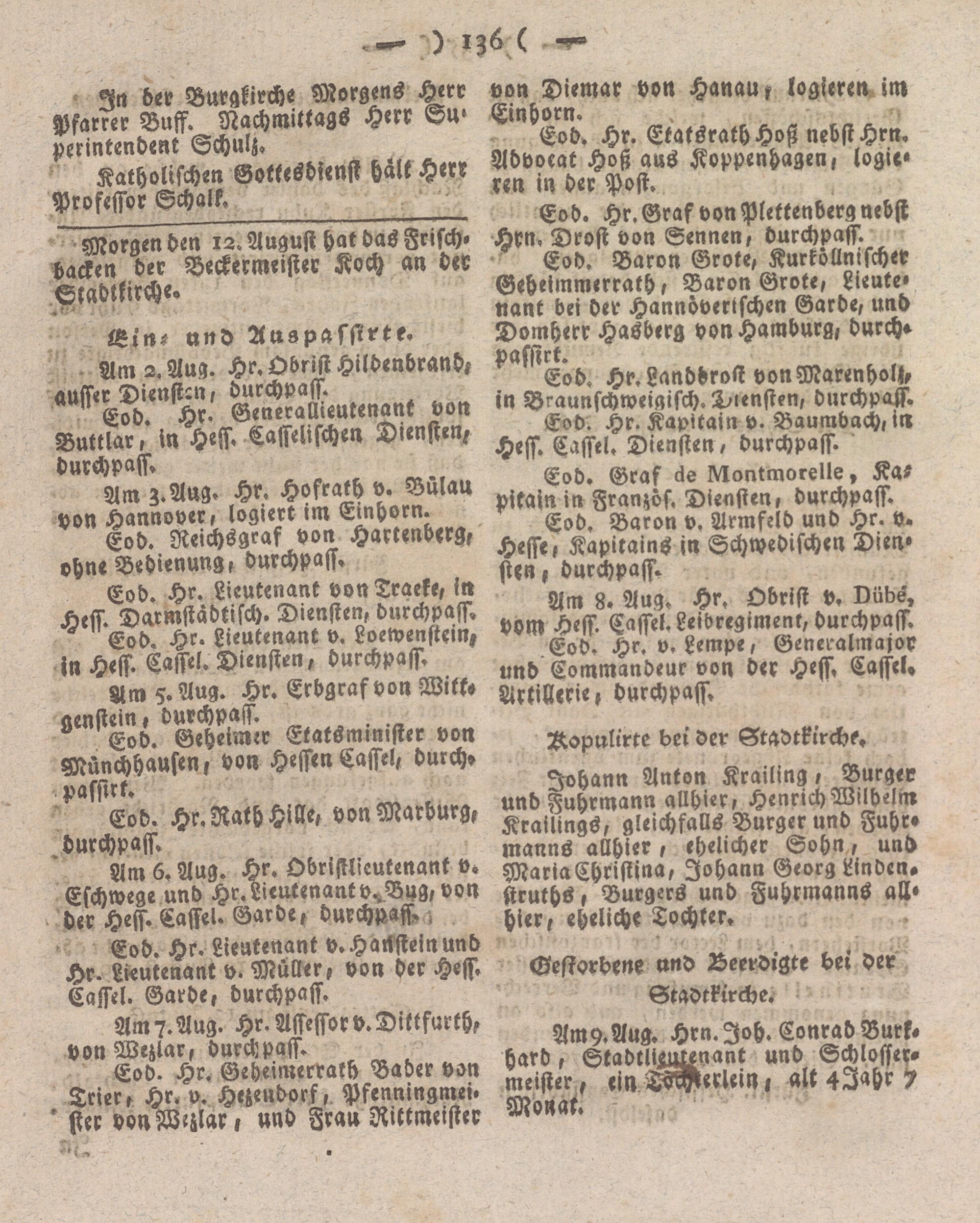 Am 6. Aug. Hr. Obristlieutenank v. Efchwege und Hr. Lieutenant v^Bug, von der Hess. Cassel. Garde, durchpaff.
