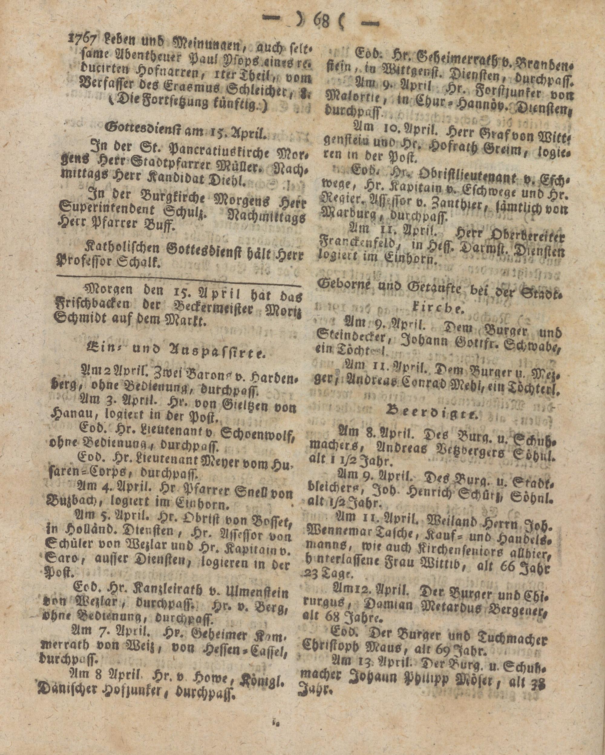 .Eod. Hr.Lieurenant Meyer vom ki« faren-Corps, durchpass. ^ervomHU' _ Am 4. April. Hr Pfarrer Snell von Buzbach, logiert im Eurhorn.