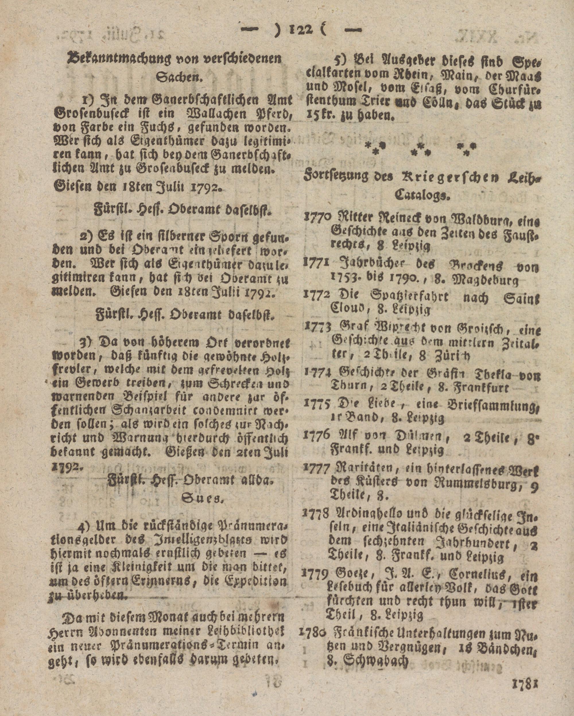 i) In den» Ganerbschaftlichen Amt Grofenbuseck ist ein Wallachen Pferd, von Farbe ein Fuchs, gefunden worden. Wirr sich als Eiqenthümer dazu legitimi« ren kann, hak sich deydemGanerbfchzft- lichen Amt zu Grofenbuseck zu melden» Giesen den illten Iulit 1792.