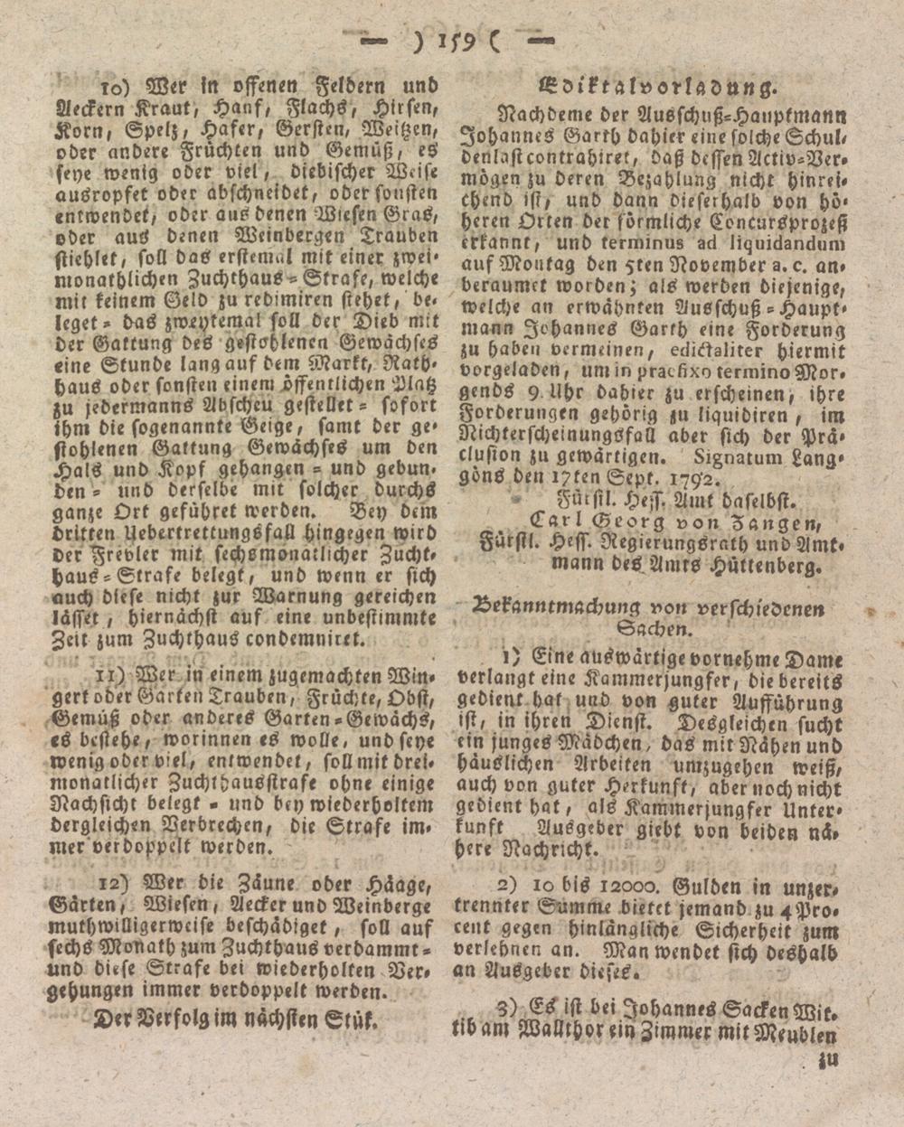 Nachdeme der Ausschuß-Hauptmann Johannes Garth dahier eine solche Schul, denlastcontrahiret, daß dessen Activ-Ver, mögen zu deren Bezahlung nicht hinrei, chend ist, und dann dieserhalb von hö« Heren Orten der förmliche Concursprozeß erkannt, und terminus ad liquidandum auf Montag den ;ten November a. c. an» beraumet worden; als werden diejenige, welche an erwähnten Ausschuß-Haupt- mann Johannes Garth eine Forderung zu haben vermeinen, ediftaliter hiermit vorgeladen, um in pracfixo termino Mor, gcnds 9 Uhr dahier zu erscheinen, ihre Forderungen gehörig zu liquidiren, im Nichterscheinungsfall aber sich der Pra- clusion zu gewärtigen. Signatum Langgöns den i7ten Sept. 179'2.