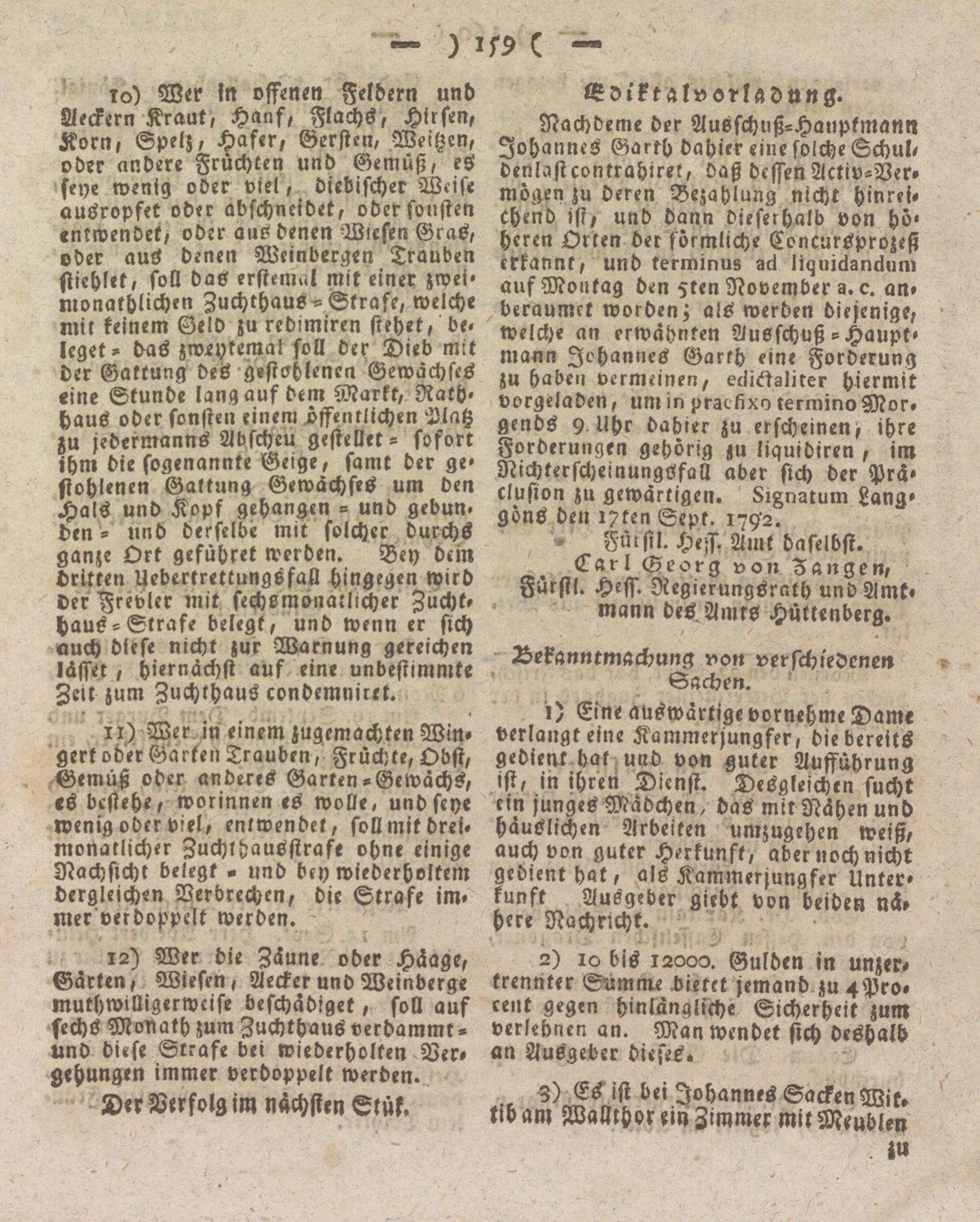 12) Wer die Zäune oder Häage, Gärten, Wiesen, Aecker und Weinberge muthwilligerwcise beschädiget, soll auf sechs Moilath zum Zuchthaus verdammrund diese Strafe bei wiederholten Ver, gehungen immer verdoppelt werden.