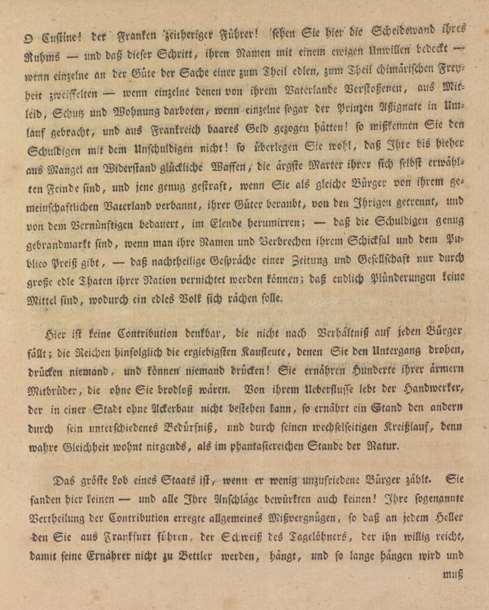 Das gröste Lob eines Staats ist, wenn er wenig unzufriedene Bürger zahlt. Sie fanden hier keinen— und alle Ihre Anschläge bewürktcn auch keinen! Ihre sogenannte Verthcilung der Contribution erregte allgemeines Mißvergnügen, so daß an jedem Heller den Sie aus Frankfurt führen, der Schweiß des Tagelöhners, der ihn willig reicht, damit feine Ernährer nicht zu Bettler werden, hängt, und fo lange hangen wird und muß