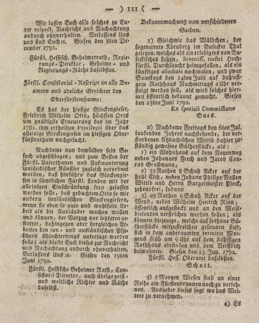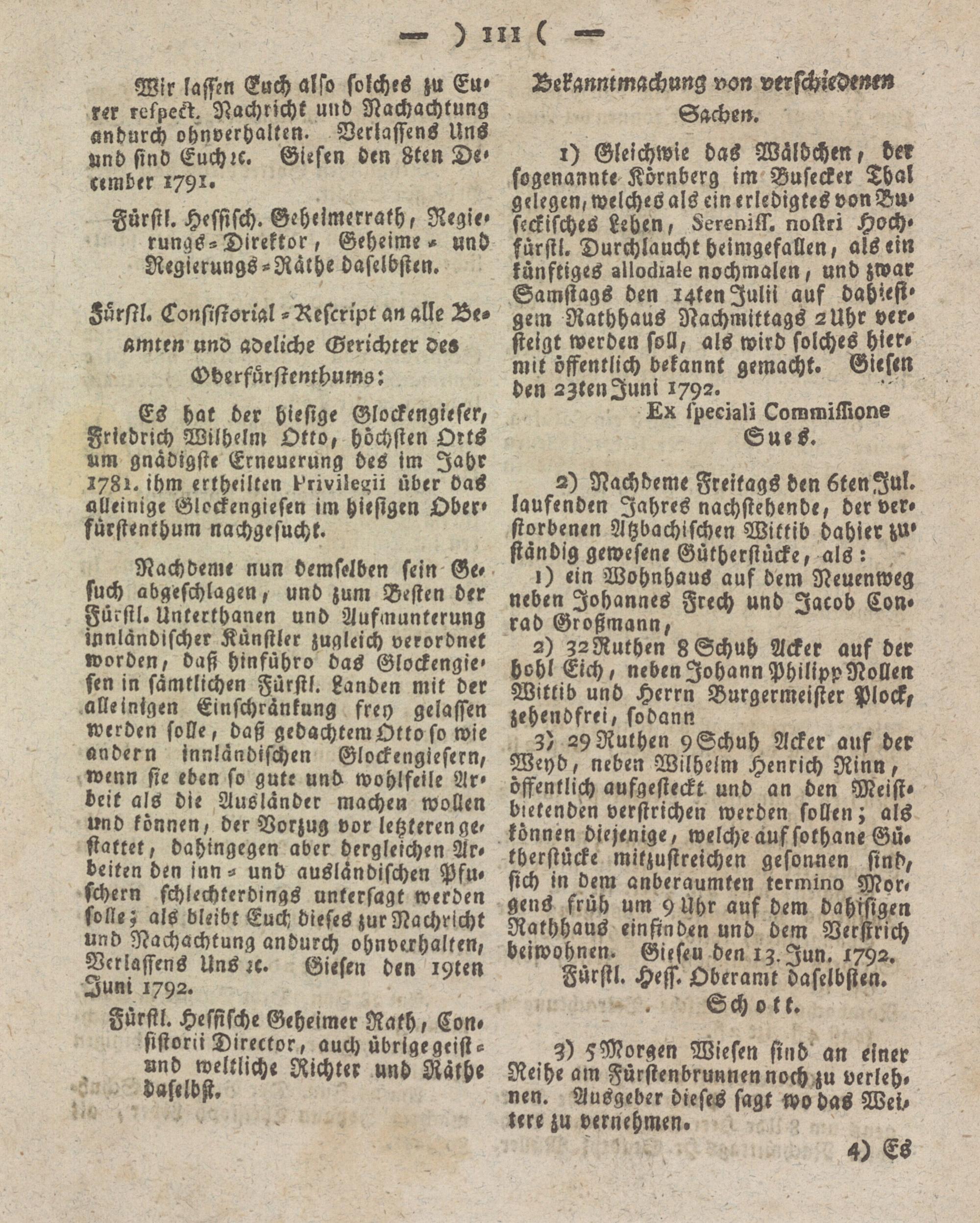 3) 29 Ruthen 9 Schuh Acker auf der Weyd, neben Wilhelm Henrich Rinn, öffentlich aufgesteckt und an den Meistbietenden verstrichen werden sollen; als können diejenige, welche aufsothane Gü- therstücke mitzusireichen gesonnen sind, sich in dem anberaumten termino Morgens früh um 9 Uhr auf dem dahfsigen Rathhaus einfinden und dem Verstrich beiwohnen. Gieseu den iz. Jun. 1792.