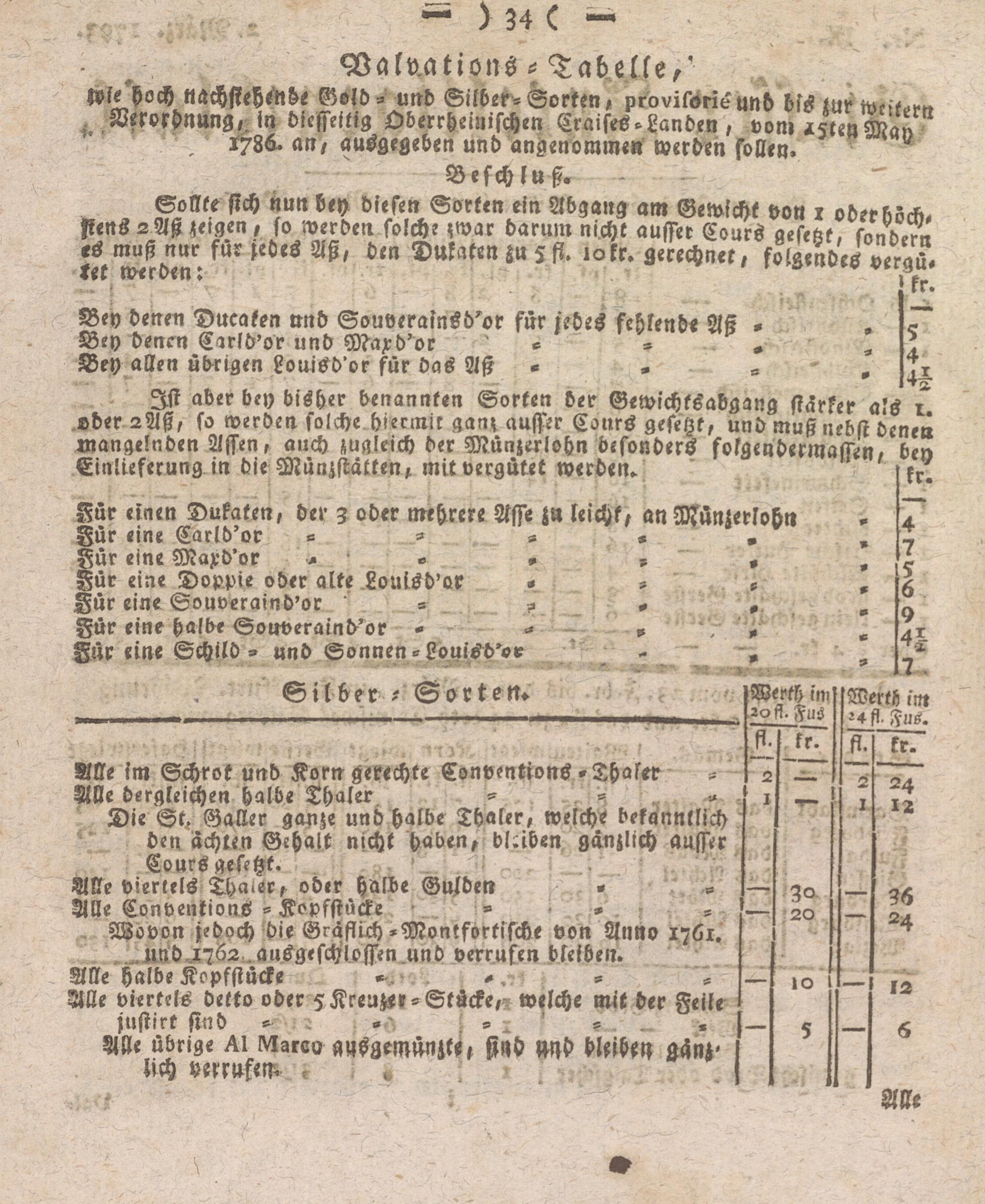 Ist aber bey bisher benannten Sorten der Gewichtsabgang stärker a.'s 1 ober aAß, so werden solche hiermit ganz äusser Cours gesetzt, und muß nebst denen mangelnden Affen, auch zugleich der Münzerlohn besonders folgendermassen, bey Einlieferung in die Münzstätten, mit vergütet werden. tr