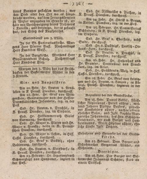 Eod. Hr. Lieuten. v. Drechsel, in K> Preuss- Diensten, log. im Einhorn.
