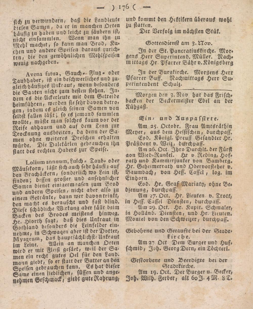 Am 26. Ocr Jhro Durchlt. der Fürst aon Wied-Runkel. Hr v Reding, Hof. rath und Kammrrjunker von Bamberg. Hr. Geheimerrath und Odervorsteher v. Baumvach, von Hess. Cassel, log. im Einhorn.