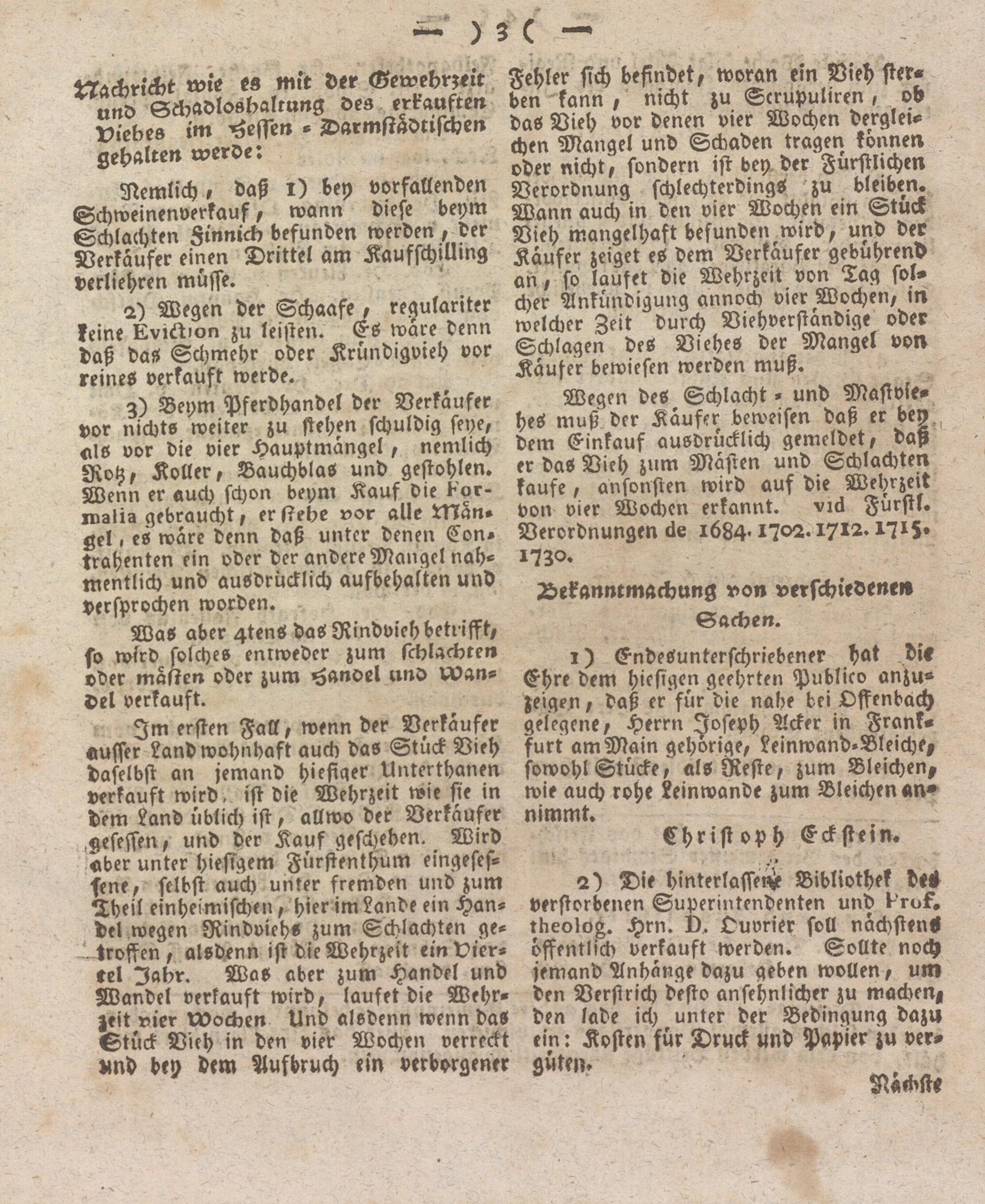 2) Die hinterlassene Bibliothek dttl verstorbenen Superintendenten und Prof, theolog. Hrn. D, Ouvrier soll nächstenöffentlich verkauft werden. Sollte noch jemand Anhänge dazu geben wollen, um den Versirich desto ansehnlicher zu machen, den lade ich unter der Bedingung dazu ein: Kosten für Druck und Papier zu vergüten.