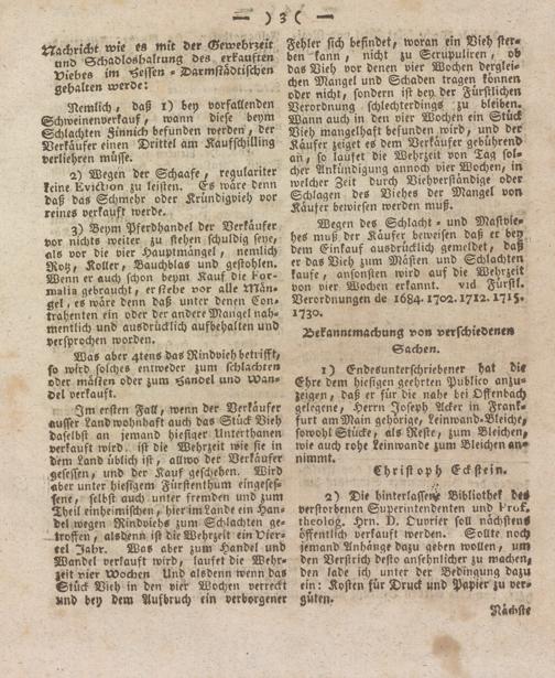 Nemlich, daß 1) bey vorfallenden Schweinenverkauf, wann diese beym Schlachten Sinnicb befunden werden , der Verkäufer einen Drittel am Kaufschillmg verliehren müsse.