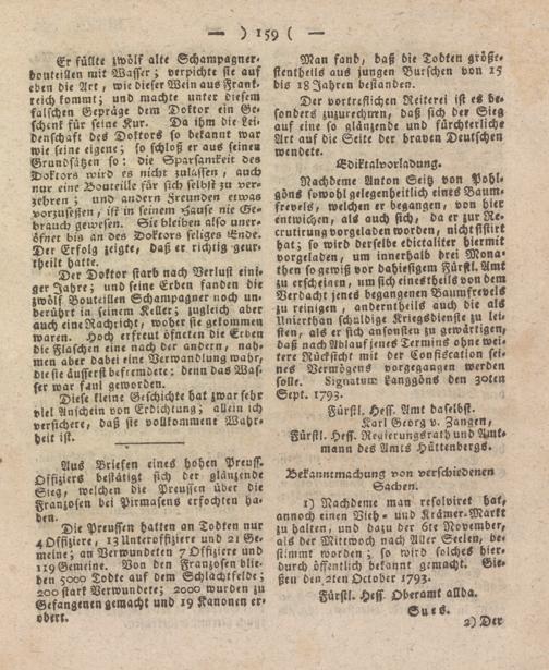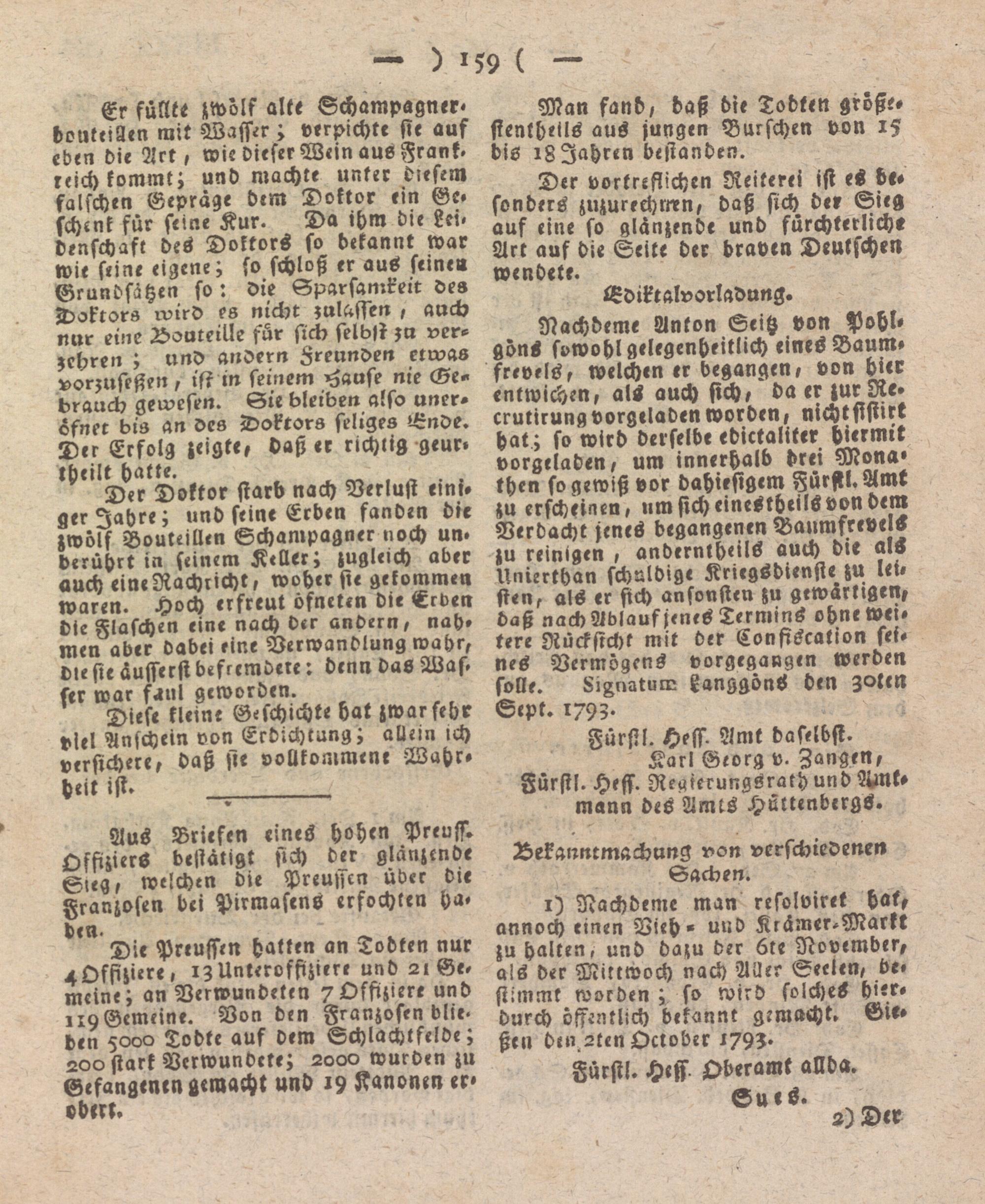 Nachdem« Anton Seitz von Pohl- göns sowohl gelegenheitlich eines Baumfrevels, welchen er begangen, von hier entwichen, als auch sich, da er zur Re- crutirungvorgeladen worden, nichtsistlkt hat; so wird derselbe edictaliter biermrt vorgeladen, um innerhalb drei SDtona* then so gewiß vor dahiesigem Fürst«. Amt zu erscheinen, um sich einestheilsvon dem Verdacht jenes begangenen Baumfrevels zu reinigen , anderntheils auch die a!S Unierthan schuldige Kriegsdienste zu lei, st«n, als er sich ansonsten zu gewärtigen, daß nachAblaufjenes Termins ohnewet- tere Rücksicht mit der Confiscation sei- nes Vermögens vorgegangen werden solle. Signatum Langgöns den Zvten Sept. 1793-