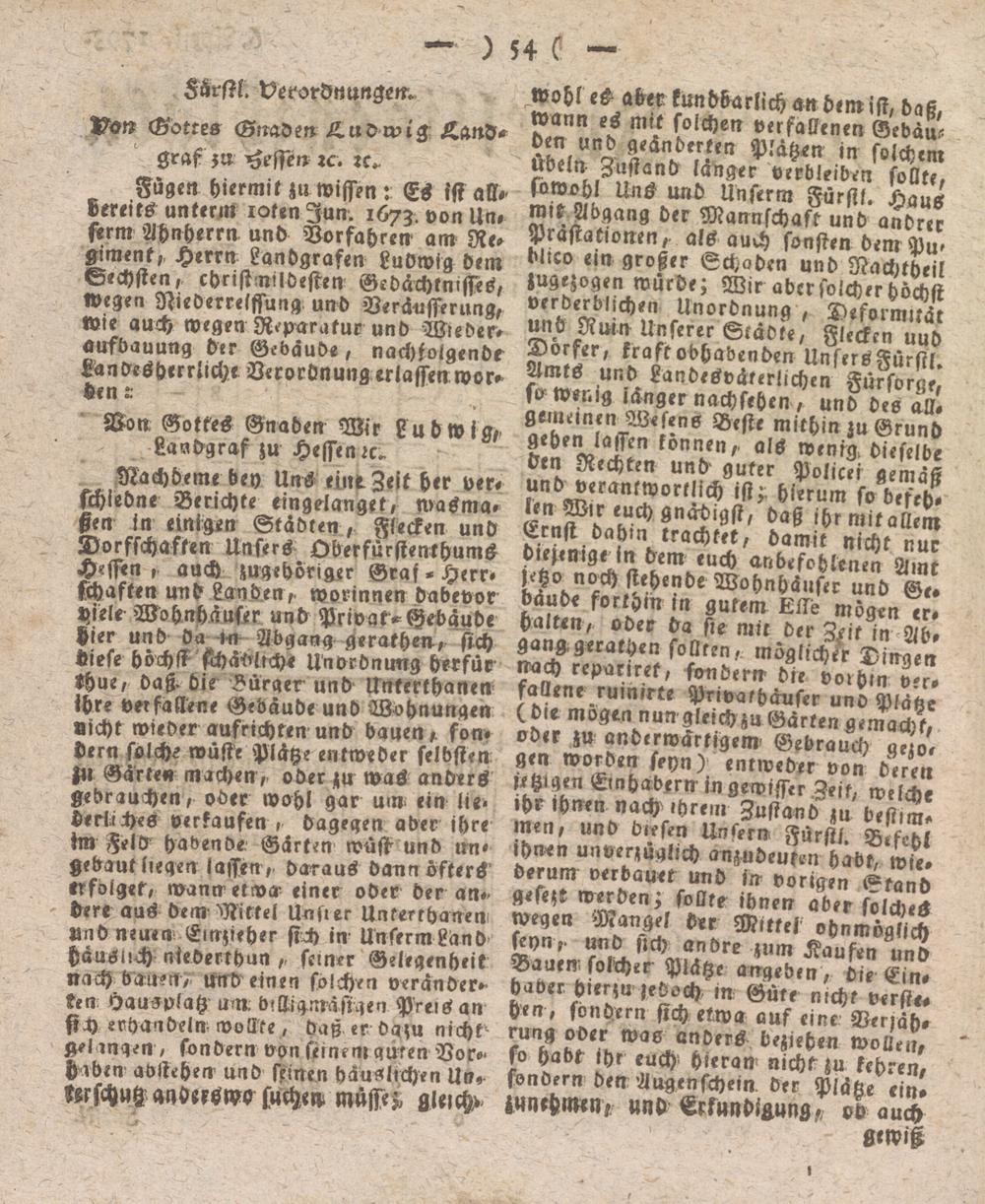 Fügen hiermit zu wissen: Es ist all-- bereits unterm iQtenJun. 1673. von Un# ferm Ahnherrn unb Vorfahren am Re- giment,, Herrn Landgrafen Ludwig dem Sechsten,, christnildesten Gedächtnisses, Wegen Niederrekffung und Veräusserung, Wie auch wegen Reparatur und Wleder- aufbauung der Gebäude, nachfolgende Iandesderrliche Verordnung erlassen wor» den