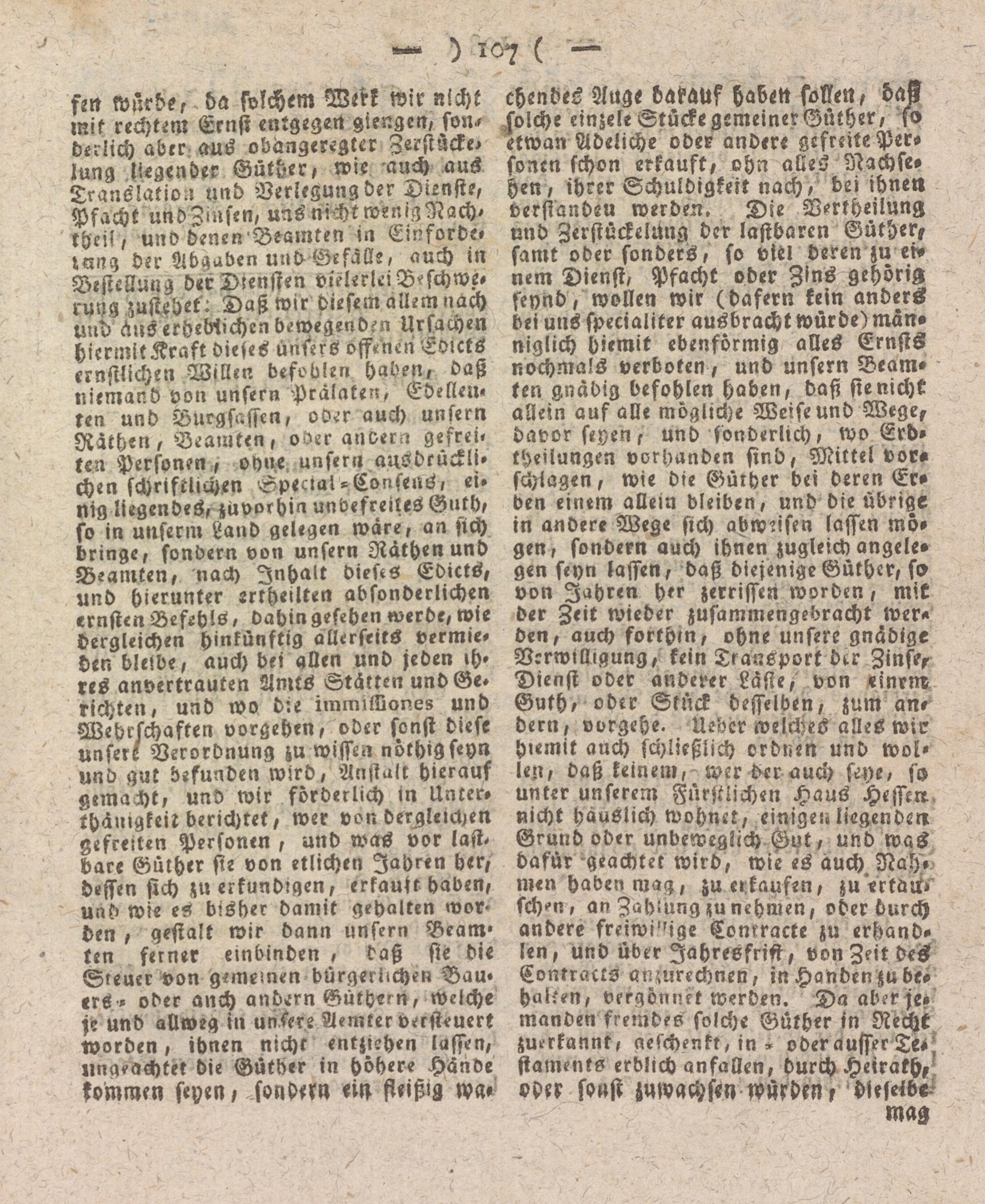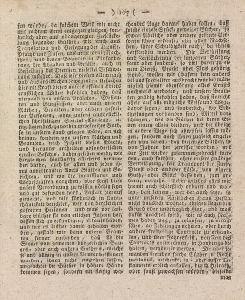 chendes Auge bakäUf habett sollen, öa§ solche einzele Stücke gemeiner Güther, so etwan Adeliche oder andere gefreite Personen schon erkauft, ohn alles Nachsehen, ihrer Schuldigkeit nach, bei ihnen verstandeu werden. Die Verthrilung und Zersiückelüng der lastbaren Güther, samt oder sonders, so viel deren zu ebnem Dienst, Pfacht oder Zins gehörig feynd, wollen wir (dafern kein anders bei uns specialiter ausbracht würde) män- niglich hiemit ebenförmig alles Ernsts nochmals verboten, und unfern Beamten gnädig befohlen haben, daß ftenid)t allein auf alle mögliche Weise und Wege, davor sepen, und sonderlich, wo Erd- theilungen vorhanden sind, Mittel Vorschlägen, wie die Güther bei deren Erben einem allein bleiben, und die übrige in andere Wege sich abwstsen lassen mögen, sondern auch ihnen zugleich angelegen seyn lassen, daß diejenige Güther, so von Jahren her zerrissen worden, mit der Zeit wieder zusammengebracht werden, auch forthin, ohne unsere gnädige Vrrwilligung, kein Transport der Zinse, Dienst oder anderer Löste, von einm Guth, oder Stück desselben, zum an, dern, vorgehe. Uebcr welches alles wir hiemit auch schließlich ordnen und wollen, daß keinem, wer der auch ftye, so unter unserem Fürstlichen Haus Hessen nicht häuslich wohnet, einigen liegenden Grund oder unbeweglich Put, und was dafür geachtet wird, wie es auch Nah» m«n haben mag, zu erkaufen, zu ertütt> sch^n, an Zahlung zu nehmen, oder durch andere freiwi''ige Comracke zu erhand- len, und über Jahresfrist, von Zeit des Conrracts anzurechnen, in Händen zube- haiten, vergönnet werden. Da aber jemanden fremdes solche Güther in Recht zuerkannt, aeschenkr, in - oder äusser Te- , staments erblich anfallen, durch Heirath, oder sonst Zuwächsen würden, dieselbe
