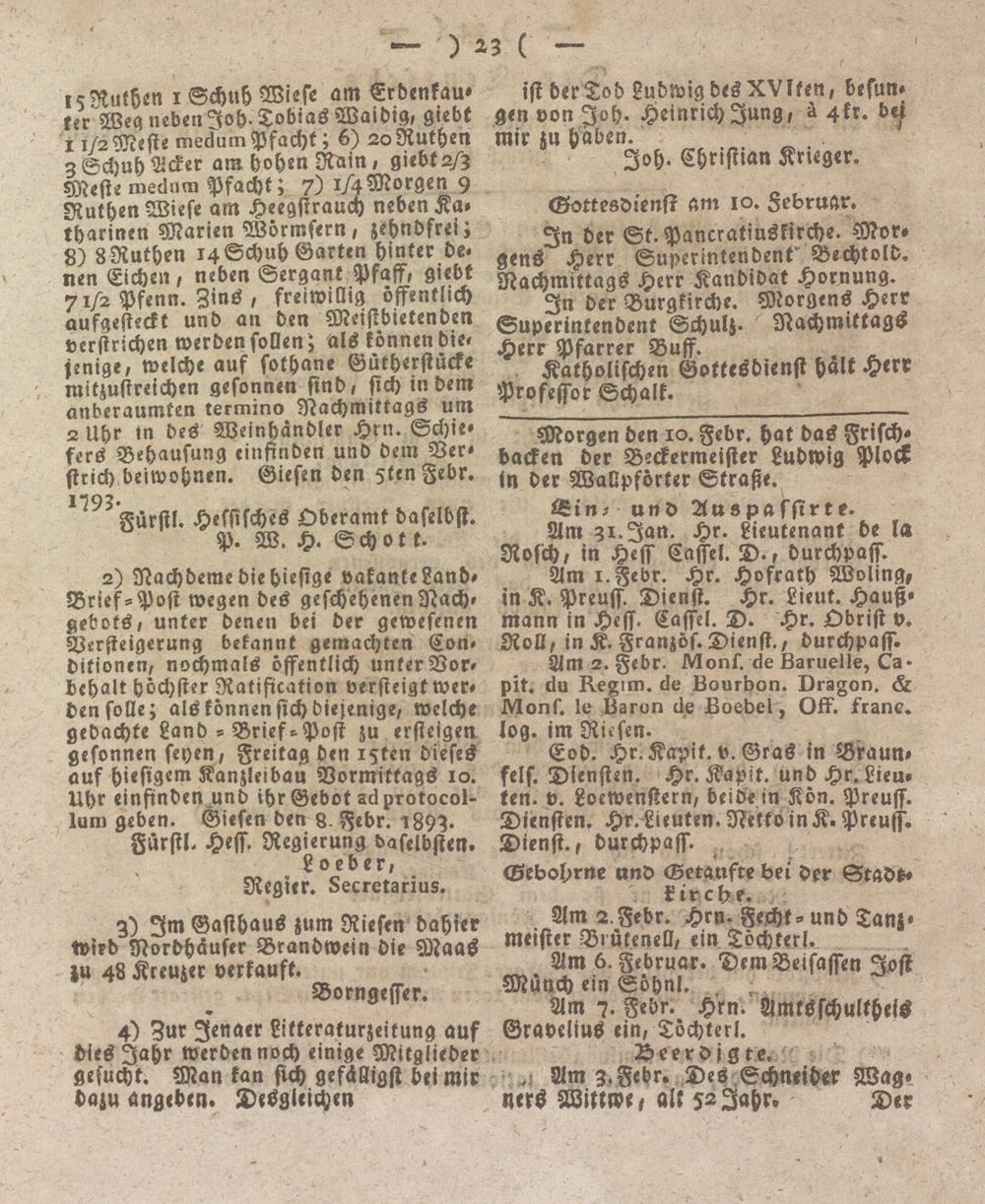 Am l.Fevr. Hr. Hofrath Woling, in K. Preuss. Dienst. Hr. Lieut. Hauß- mann in Hess. Cassel. D. Hr. Obrift v. Roll, in K. Französ. Dienst., durchpass.