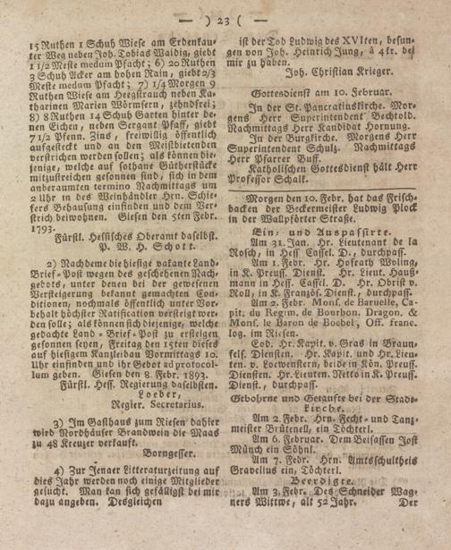 ,;R»IH-N I Schuh W!-f- am Erdinkau- ker Weq neben Joh. Tobias Waidig, giebt i 1/2 Messe medum Pfacht ; 6) 20 Ruthen 8 Schuh Acker am hohen Rain, giebt2/3 Meste medum Pfacht; 7) 1/4 Morgen 9 Ruthen Wiese am Heegstrauch neben Ka, tharinen Marien Wörmfern, zehndfrei; 8) 8Ruthen i4Schuh Garten hinter de« nen Eichen, neben Sergant Pfaff, giebt 71/2 Pfenn. Zins, freiwillig öffentlich aufgesteckt und an den Meistbietenden verstrichen werden sollen; als können die, Wenige, welche auf sothane Gütherstücke mitzustreichen gesonnen sind, sich indem anberaumten termino Nachmittags um 2 Uhr in des Weinhandler Hrn. Schi«, fers Behausung einfinden und dem Ver« strich beiwohnen. Giesen den §tenFebr. 1*193.