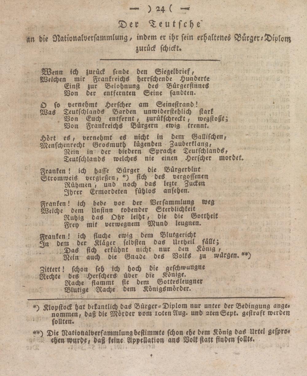*) Klopstock hat bekantlich das Bürger-Diplom nur unter der Bedingung angenommen, daß die Mörder vom roten Aug. und -renSept. gestraft werden sollten.