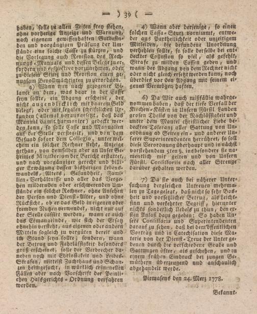 6) Da Wir auch mißfällig wahrgenommen haben, daß der tiefe Verfall der Kirchen-Kästen in Unfern Fürst!. Landen großen Theils von der Nachläsfigkeitund unter dem Mantel christlicher Liebe be» deckten Toleranz aller Gattung von Unordnung ab Seitenein - und anderer Unserer Superintendenten herrühret, so soll diese Verordnung überhaupt und innächst vorstehendem ;ten§. insbesondere sie namentlich mit gelten und von Unfern Fürst!. Confiftoriis nach aller Strenge darüber gehalten werben.