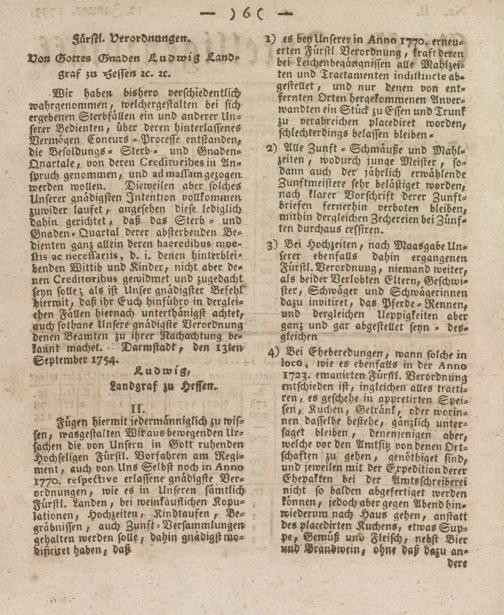 Wir haben bishero verschiedentlich- wahrgenommenwelchergestalten bei sich ergebenen Sterbfällen ein und anderer Unserer Bedienten, über deren hinterlassenes Vermögen ConcurS - Proteste entstanden, die BesoldungS- Sterb - und Gnaden- Qnartale, von deren Crediruribesm Anspruch genommen, und ad maflam gezogen werden wollen. Dieweilen aber solches Unserer gnädigsten Intention vollkommen, zuwider laufet, angesehen diese lediglich dahin gerichtet, daß das Sterb - und Gnaden- Quartal derer absterbenden Bedienten ganz allein deren haeredibus moe- fiis ac neceffariis, d. i. denen Hinterblei- Lenden Wittib und Kinder, nicht aber denen Creditoribus gewidmet und zugedacht, feyn solle; als ist Unser gnädigster Befehl' hiermit, daß ihr Huch hinführo in dergleichen Fällen hiernach unterthanigst achtet, auch sothane Unsere gnädigste Verordnung denen Beamten zu ihrer Nachachtung bekannt machet.. Darmstadt, den izten September 1754-