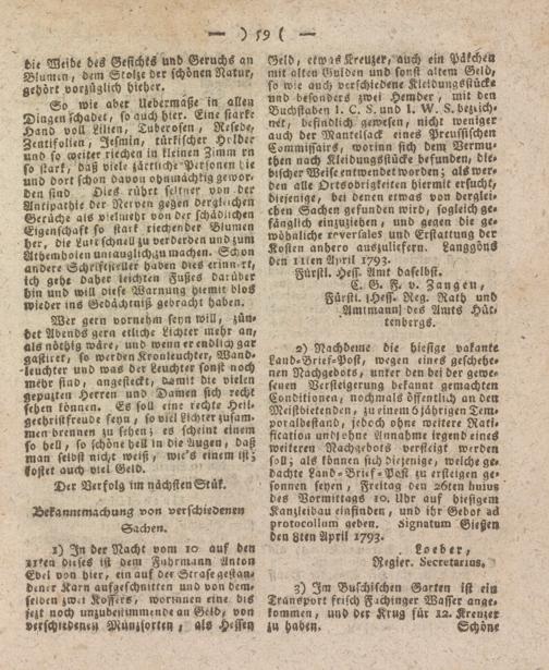 Geld, etwas Kreuzek, auch ern Päkchea mit alten Cmiöen und sonst altem Gelb, so wie auch verschiedene Kleidungsstücke und besonders zwei Hemder, mit den Buchstaben l. C. 8. und l. W. 8. bezuch- tut, befindlich gewesen, nicht weniger auch der Mantelsack eines Preussischen CommissairS, worinn sich dem Vermu- then nach Kleidungsstück« befunden, diebischer Weife entwendet worden; als werden alle Ortsodrigkeiten hiermit ersucht, diejenige, bei denen etwas von dergleichen Sachen gefunden wird, sogleichgefänglich einzuziehen, und gegen die ge- wohnliche reverfales und Erstattung der Kosten anhero auezulicfern. Langgöns den ulen April 1793. */