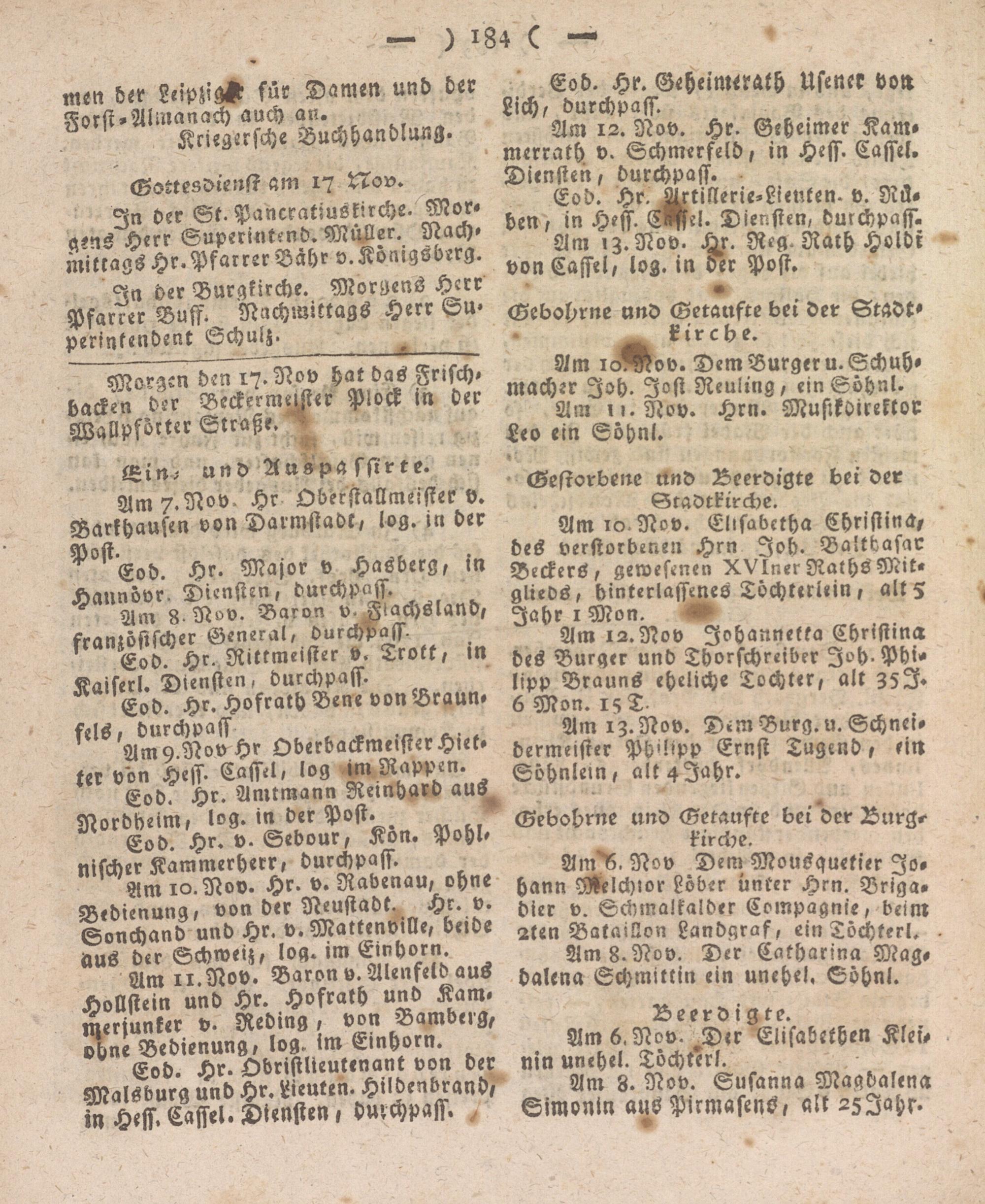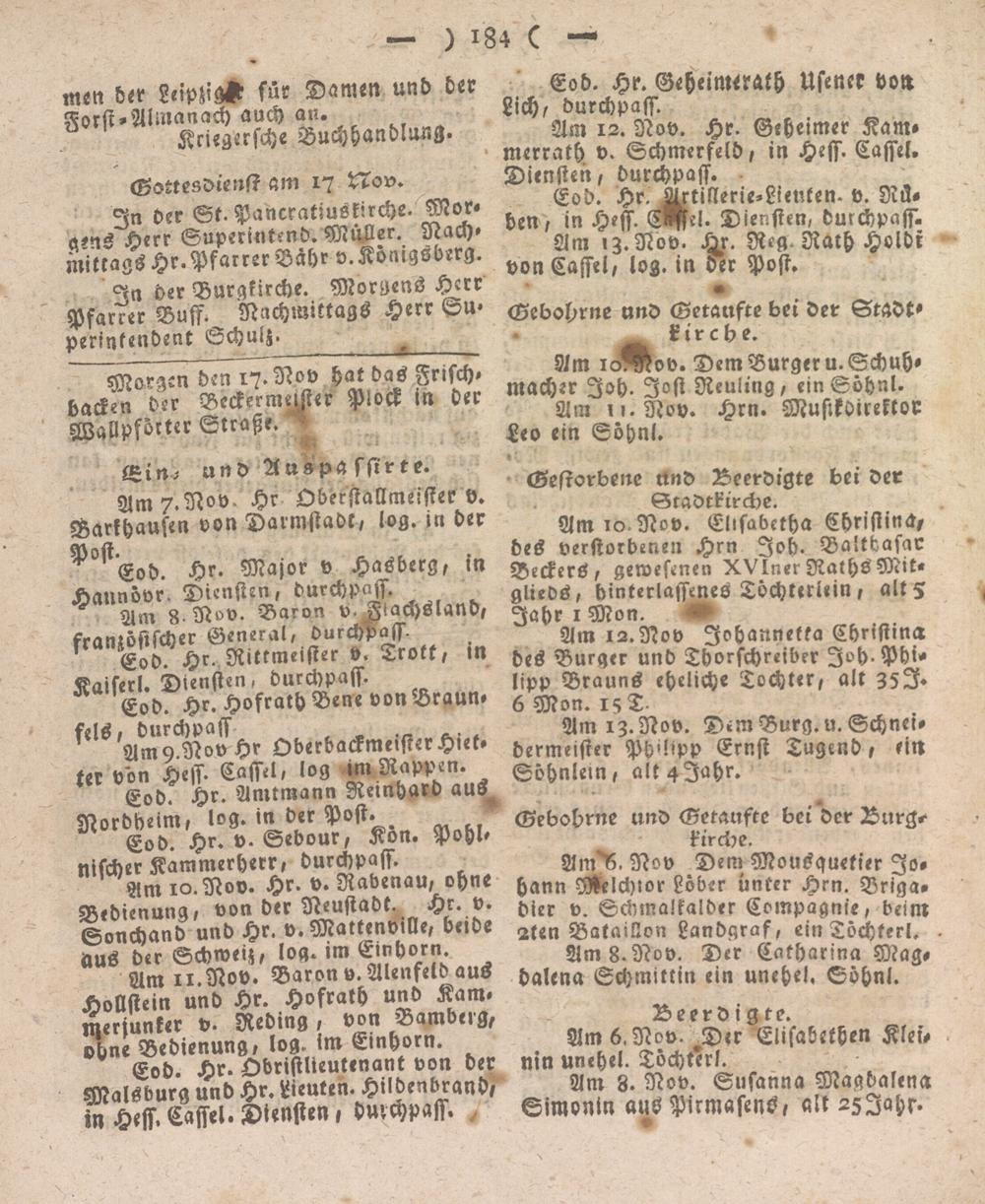 Am 12. Nov. Hr. Geheimer Kam- merrath v. Schmerfeld, in Hess. Cassel. Diensten, durchpass.
