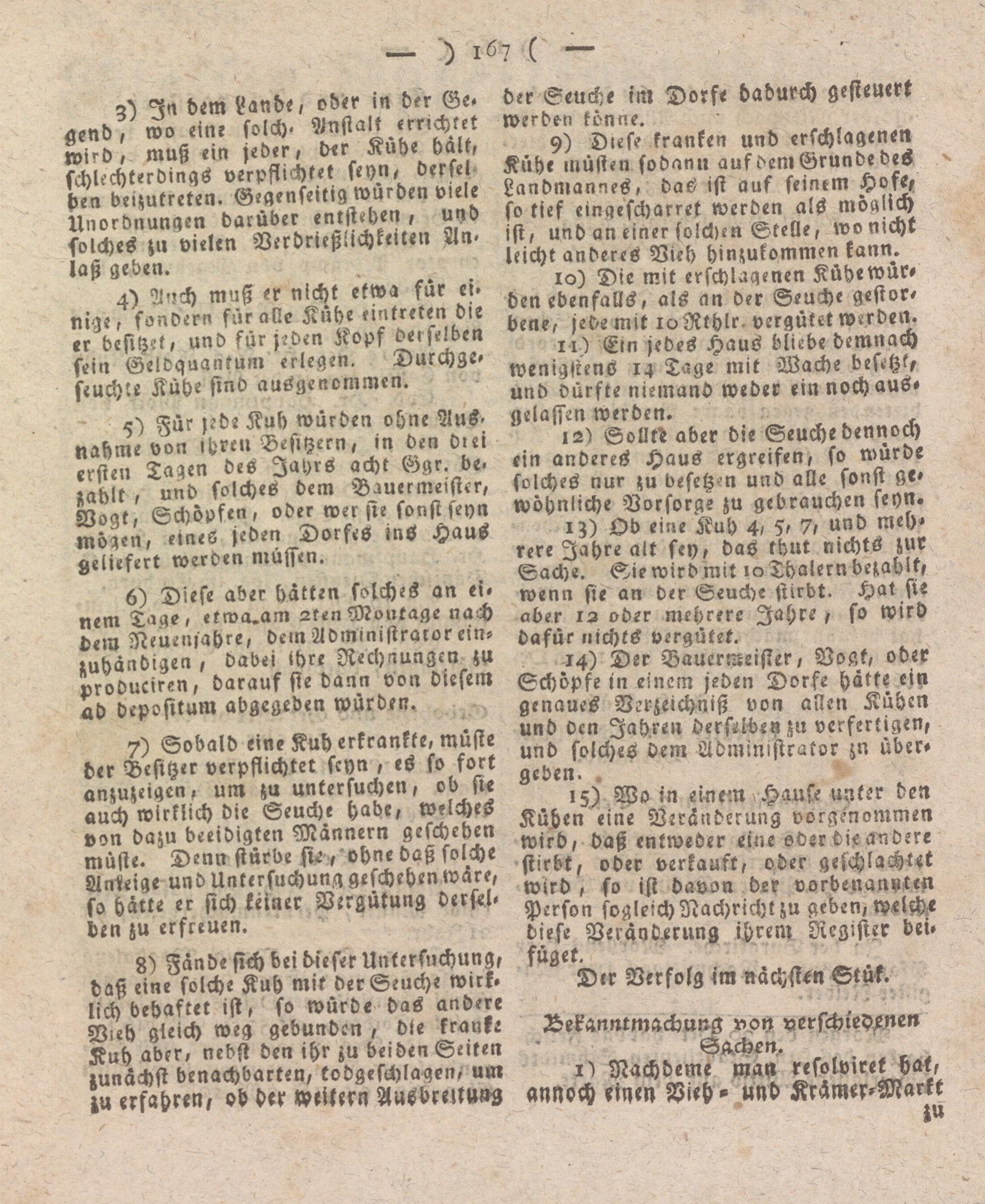 15) Wo in einem vHaufe unter den Kühen eine Veränderung vorgenommen wird, daß entweder eine sderdieandere stirbt, oder verkauft, oder geschlachtet wird, so ist davon der vorbenanntrn Person sogleich Nachricht zu geben, welche diese Veränderung ihrem Register bei, füget.