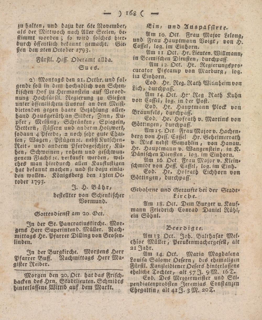 AM15. Oct FrauMajorv. Hachenberg von Hess. Cassel Hr. Geheimerrath v Ries nebst Gemahlin, von Hanau. Hr. Hauptmann v. Wangenstein, in K> Dänischen Diensten, log. im Einhorn.