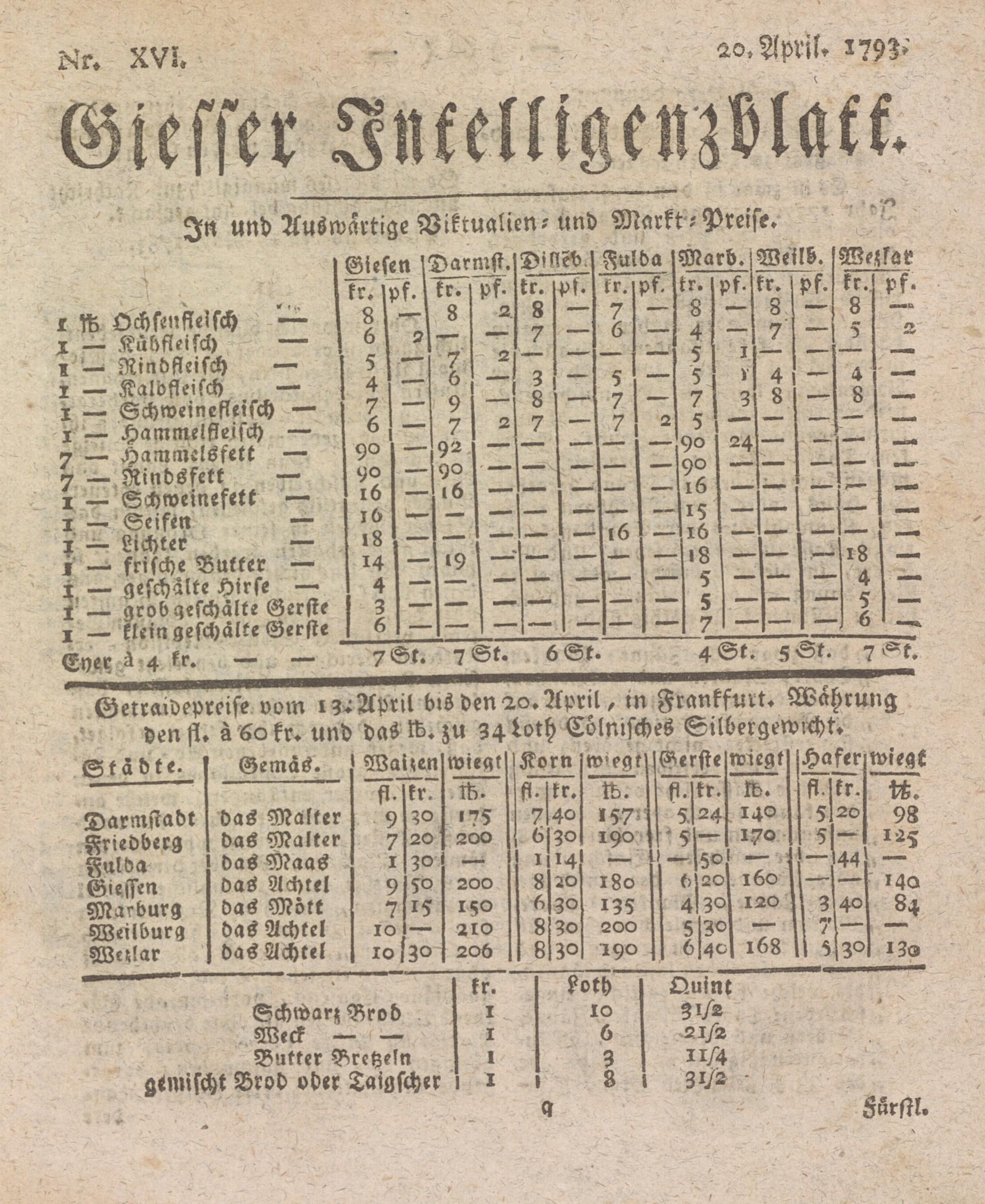Gerrawepreise vom 13^ April brs den2O.?spril, tn Frankfurt. Wahrung yen fl. ä 60 kr. und das ft. zu 34 Loch Cölmsches Silbergewrcht.