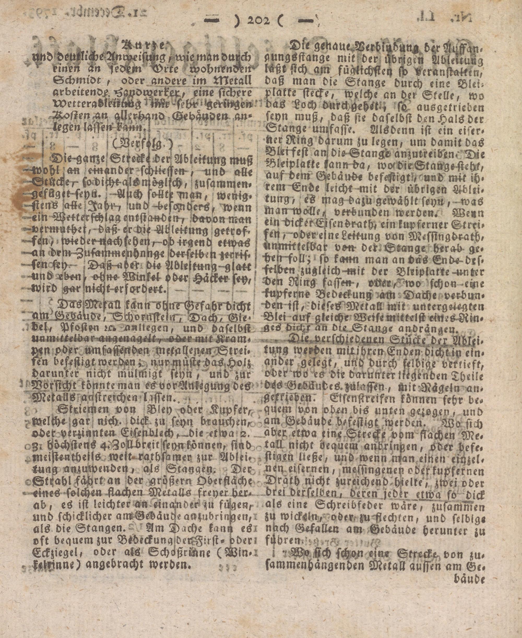 hec Ring därum zu legen, um damit das Bliessest anidis-Stangd anzutreibend Die Bleiplatte kanwDa, wosdieStan'ge steht, auf Dem Gebäude befsstigth'und mlt ih« rem-Ende leicht -mit der übrigen Ablei» tung> es mag dazu gewählt seyn, - was Mawwoüe^ verbunden werden. Wenn tinchickttEzsendrath, ein kupferner Strei» fest j-odev eine Lettung von MessingdratH, unnrrttelstar von- dek.Htange herab- ge» chetr-sollz l so kann man an Dös Ende-drs» seÜwn zugleich-mit der Blriplatte-unter
